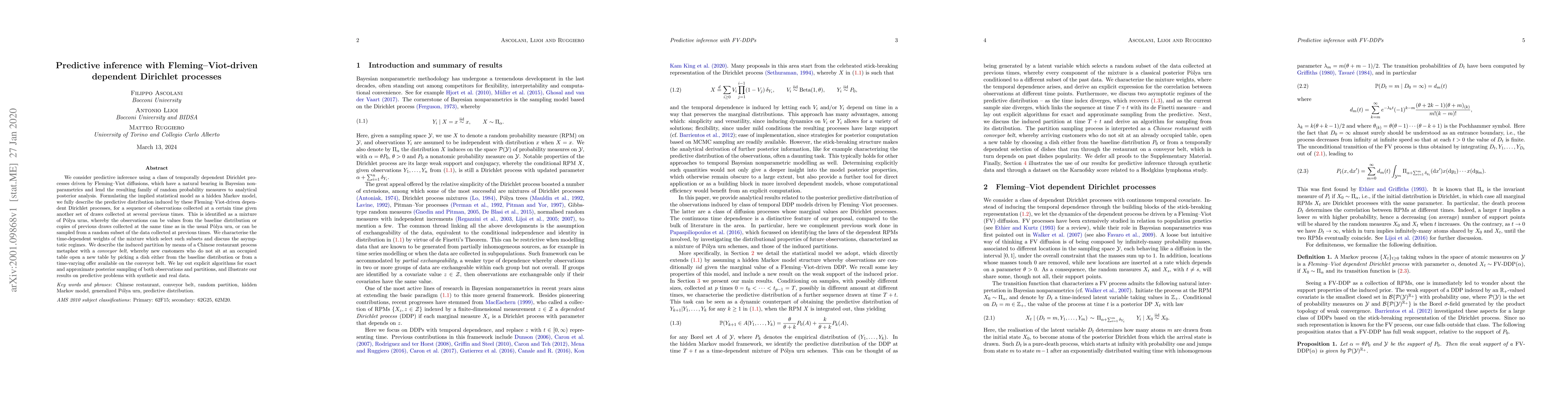 This paper develops predictive inference using Fleming-Viot-driven dependent Dirichlet processes, formulated as a hidden Markov model, and characterizes their mixture of Pólya urns for temporal data. It introduces algorithms for posterior sampling and applies the method to synthetic and real data.