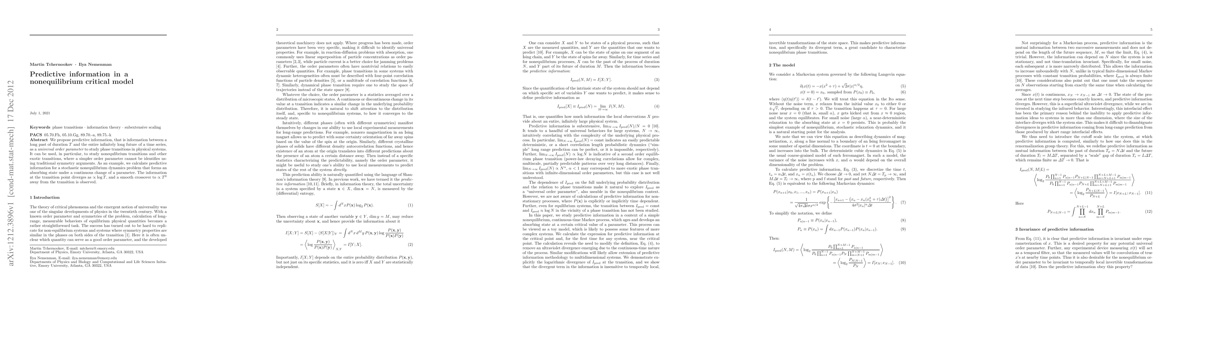 We propose predictive information, that is information between a long past of duration T and the entire infinitely long future of a time series, as a universal order parameter to study phase transitions in physical systems. It can be used, in particular, to study nonequlibrium transitions and other exotic transitions, where a simpler order parameter cannot be identifies using traditional symmetry arguments. As an example, we calculate predictive information for a stochastic nonequilibrium dynamics problem that forms an absorbing state under a continuous change of a parameter. The information at the transition point diverges as log(T), and a smooth crossover to constant away from the transition is observed.