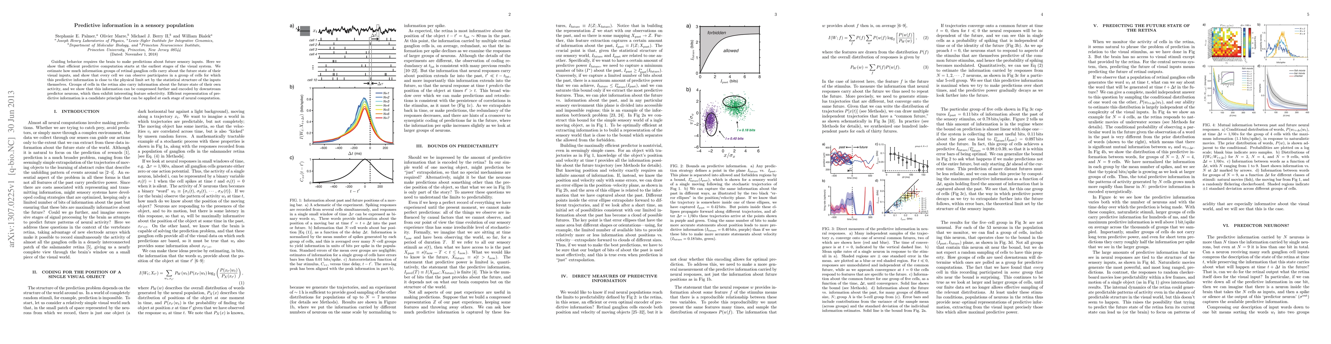 Guiding behavior requires the brain to make predictions about future sensory inputs. Here we show that efficient predictive computation starts at the earliest stages of the visual system. We estimate how much information groups of retinal ganglion cells carry about the future state of their visual inputs, and show that every cell we can observe participates in a group of cells for which this predictive information is close to the physical limit set by the statistical structure of the inputs themselves. Groups of cells in the retina also carry information about the future state of their own activity, and we show that this information can be compressed further and encoded by downstream predictor neurons, which then exhibit interesting feature selectivity. Efficient representation of predictive information is a candidate principle that can be applied at each stage of neural computation.