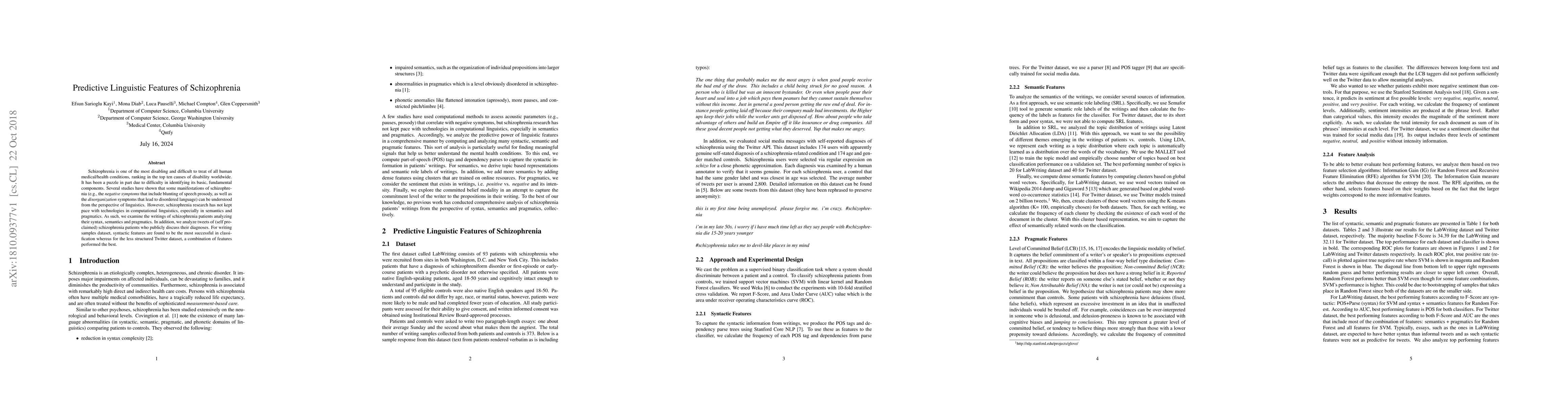 Schizophrenia is one of the most disabling and difficult to treat of all human medical/health conditions, ranking in the top ten causes of disability worldwide. It has been a puzzle in part due to difficulty in identifying its basic, fundamental components. Several studies have shown that some manifestations of schizophrenia (e.g., the negative symptoms that include blunting of speech prosody, as well as the disorganization symptoms that lead to disordered language) can be understood from the perspective of linguistics. However, schizophrenia research has not kept pace with technologies in computational linguistics, especially in semantics and pragmatics. As such, we examine the writings of schizophrenia patients analyzing their syntax, semantics and pragmatics. In addition, we analyze tweets of (self pro-claimed) schizophrenia patients who publicly discuss their diagnoses. For writing samples dataset, syntactic features are found to be the most successful in classification whereas for the less structured Twitter dataset, a combination of features performed the best.