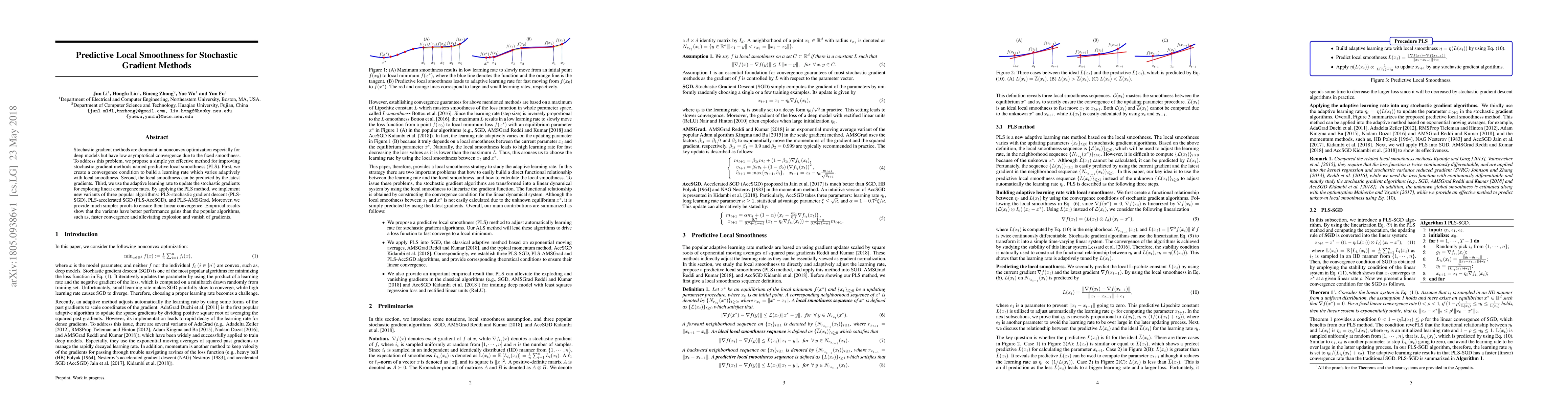 This paper proposes a method called predictive local smoothness (PLS) to improve stochastic gradient methods for nonconvex optimization, particularly in deep learning. PLS adaptively adjusts the learning rate based on predicted local smoothness from recent gradients, leading to faster convergence and better gradient stability.