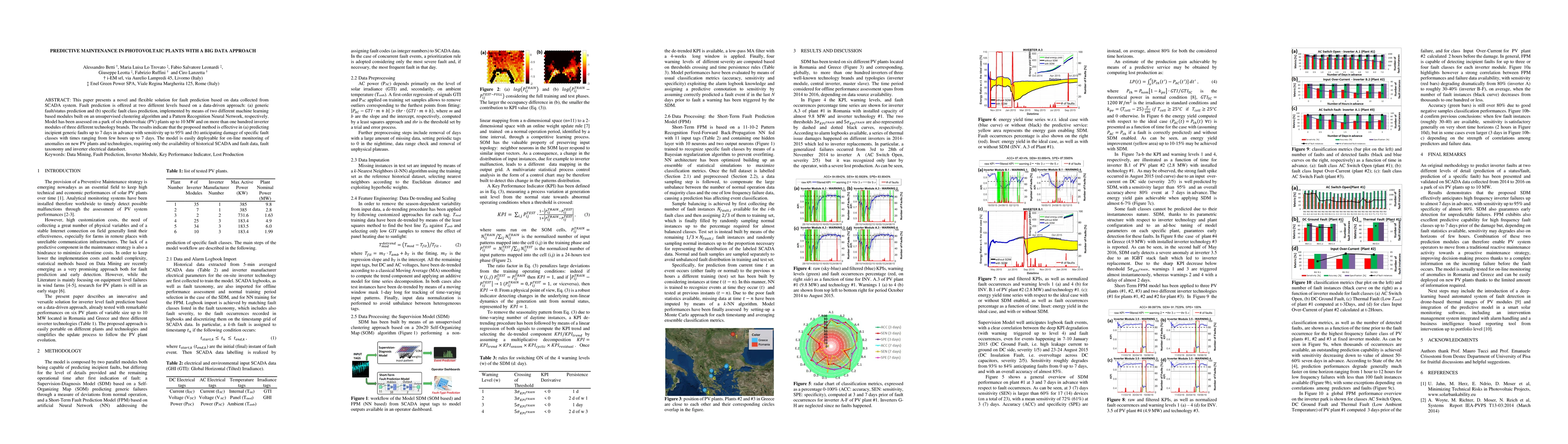 This paper presents a novel and flexible solution for fault prediction based on data collected from SCADA system. Fault prediction is offered at two different levels based on a data-driven approach: (a) generic fault/status prediction and (b) specific fault class prediction, implemented by means of two different machine learning based modules built on an unsupervised clustering algorithm and a Pattern Recognition Neural Network, respectively. Model has been assessed on a park of six photovoltaic (PV) plants up to 10 MW and on more than one hundred inverter modules of three different technology brands. The results indicate that the proposed method is effective in (a) predicting incipient generic faults up to 7 days in advance with sensitivity up to 95% and (b) anticipating damage of specific fault classes with times ranging from few hours up to 7 days. The model is easily deployable for on-line monitoring of anomalies on new PV plants and technologies, requiring only the availability of historical SCADA and fault data, fault taxonomy and inverter electrical datasheet. Keywords: Data Mining, Fault Prediction, Inverter Module, Key Performance Indicator, Lost Production