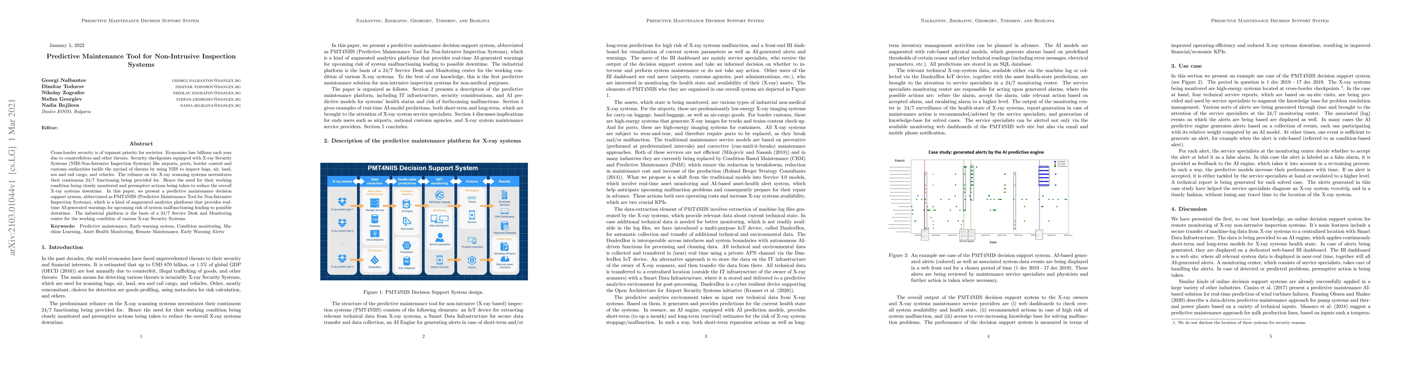 Cross-border security is of topmost priority for societies. Economies lose billions each year due to counterfeiters and other threats. Security checkpoints equipped with X-ray Security Systems (NIIS-Non-Intrusive Inspection Systems) like airports, ports, border control and customs authorities tackle the myriad of threats by using NIIS to inspect bags, air, land, sea and rail cargo, and vehicles. The reliance on the X-ray scanning systems necessitates their continuous 24/7 functioning being provided for. Hence the need for their working condition being closely monitored and preemptive actions being taken to reduce the overall X-ray systems downtime. In this paper, we present a predictive maintenance decision support system, abbreviated as PMT4NIIS (Predictive Maintenance Tool for Non-Intrusive Inspection Systems), which is a kind of augmented analytics platforms that provides real-time AI-generated warnings for upcoming risk of system malfunctioning leading to possible downtime. The industrial platform is the basis of a 24/7 Service Desk and Monitoring center for the working condition of various X-ray Security Systems.