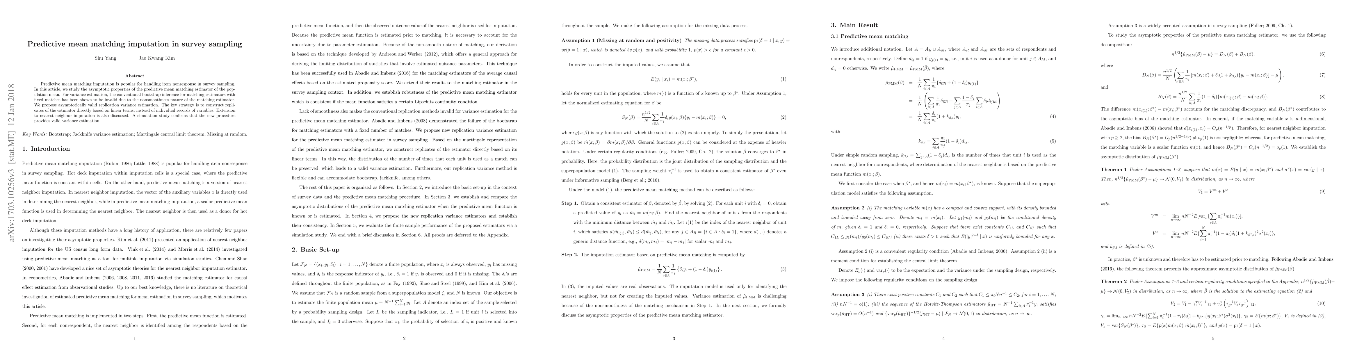 This paper investigates the asymptotic properties of predictive mean matching imputation for survey sampling, proposing a new method for valid variance estimation that constructs replicates based on linear terms rather than individual records. The study also extends the method to nearest neighbor imputation and confirms its effectiveness through simulation.