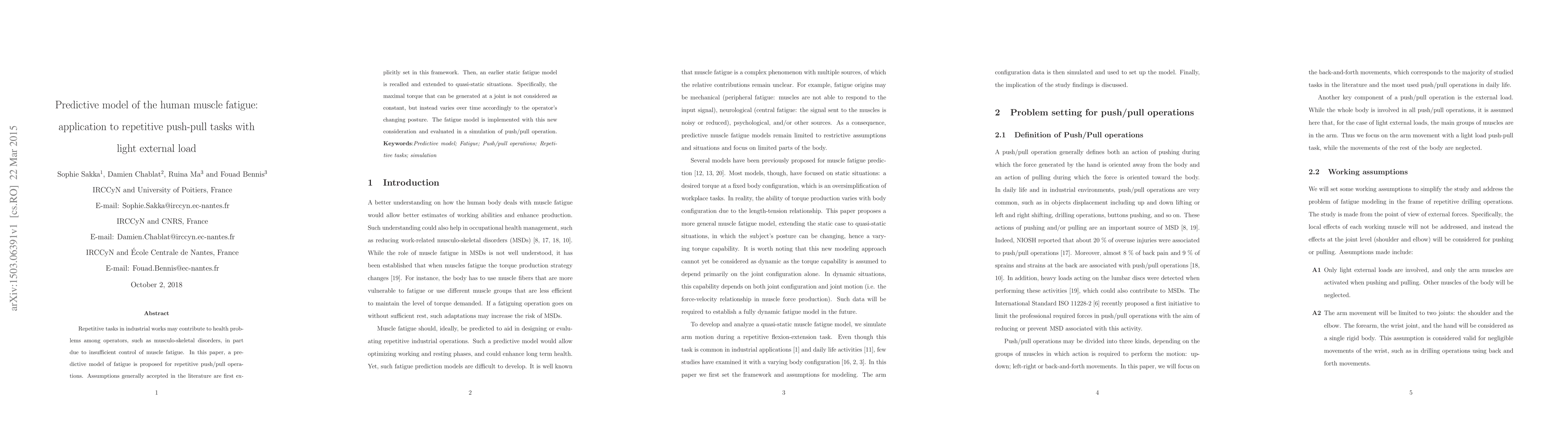 Repetitive tasks in industrial works may contribute to health problems among operators, such as musculo-skeletal disorders, in part due to insufficient control of muscle fatigue. In this paper, a predictive model of fatigue is proposed for repetitive push/pull operations. Assumptions generally accepted in the literature are first explicitly set in this framework. Then, an earlier static fatigue model is recalled and extended to quasi-static situations. Specifically, the maximal torque that can be generated at a joint is not considered as constant, but instead varies over time accordingly to the operator's changing posture. The fatigue model is implemented with this new consideration and evaluated in a simulation of push/pull operation. Reference to this paper should be made as follows: Sakka, S., Chablat, D., Ma, R. and Bennis, F. (2015) 'Predictive model of the human muscle fatigue: application to repetitive push-pull tasks with light external load', Int.