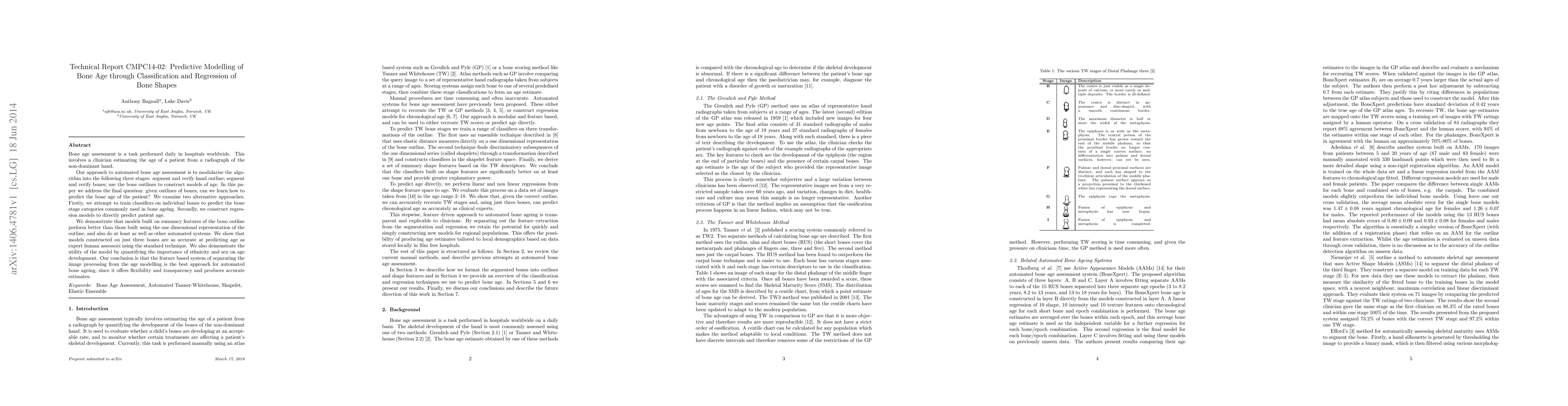 Bone age assessment is a task performed daily in hospitals worldwide. This involves a clinician estimating the age of a patient from a radiograph of the non-dominant hand. Our approach to automated bone age assessment is to modularise the algorithm into the following three stages: segment and verify hand outline; segment and verify bones; use the bone outlines to construct models of age. In this paper we address the final question: given outlines of bones, can we learn how to predict the bone age of the patient? We examine two alternative approaches. Firstly, we attempt to train classifiers on individual bones to predict the bone stage categories commonly used in bone ageing. Secondly, we construct regression models to directly predict patient age. We demonstrate that models built on summary features of the bone outline perform better than those built using the one dimensional representation of the outline, and also do at least as well as other automated systems. We show that models constructed on just three bones are as accurate at predicting age as expert human assessors using the standard technique. We also demonstrate the utility of the model by quantifying the importance of ethnicity and sex on age development. Our conclusion is that the feature based system of separating the image processing from the age modelling is the best approach for automated bone ageing, since it offers flexibility and transparency and produces accurate estimates.