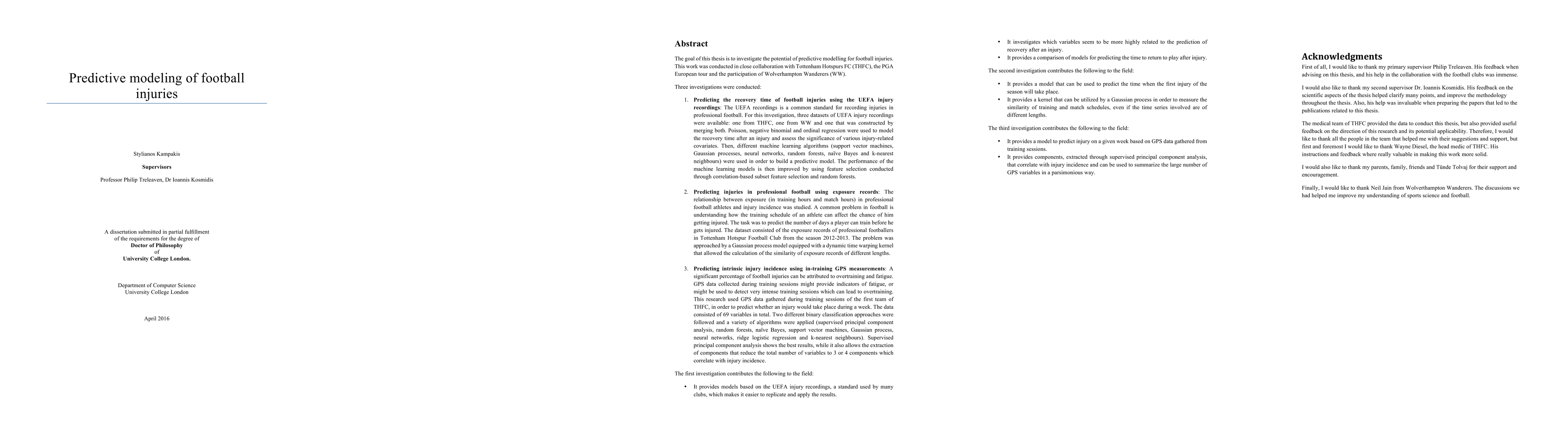 The goal of this thesis is to investigate the potential of predictive modelling for football injuries. This work was conducted in close collaboration with Tottenham Hotspurs FC (THFC), the PGA European tour and the participation of Wolverhampton Wanderers (WW). Three investigations were conducted: 1. Predicting the recovery time of football injuries using the UEFA injury recordings: The UEFA recordings is a common standard for recording injuries in professional football. For this investigation, three datasets of UEFA injury recordings were available. Different machine learning algorithms were used in order to build a predictive model. The performance of the machine learning models is then improved by using feature selection conducted through correlation-based subset feature selection and random forests. 2. Predicting injuries in professional football using exposure records: The relationship between exposure (in training hours and match hours) in professional football athletes and injury incidence was studied. A common problem in football is understanding how the training schedule of an athlete can affect the chance of him getting injured. The task was to predict the number of days a player can train before he gets injured. 3. Predicting intrinsic injury incidence using in-training GPS measurements: A significant percentage of football injuries can be attributed to overtraining and fatigue. GPS data collected during training sessions might provide indicators of fatigue, or might be used to detect very intense training sessions which can lead to overtraining. This research used GPS data gathered during training sessions of the first team of THFC, in order to predict whether an injury would take place during a week.