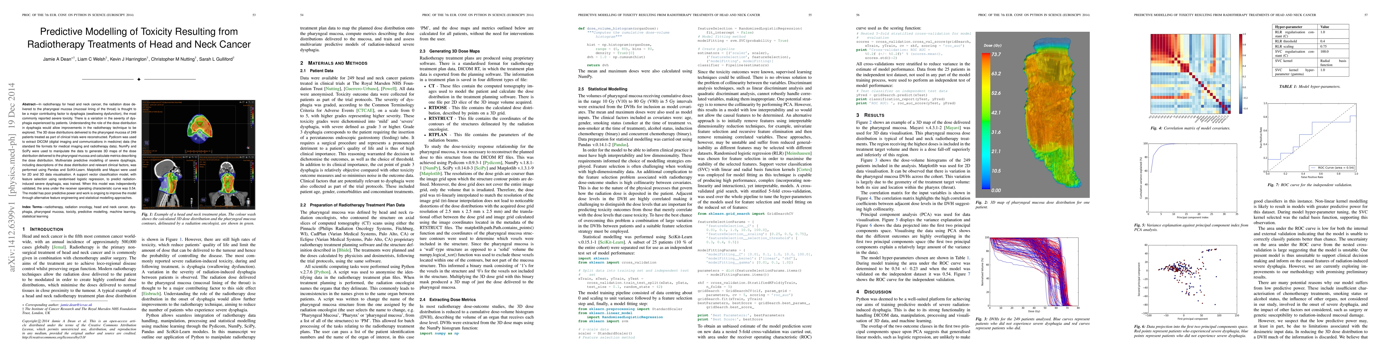 In radiotherapy for head and neck cancer, the radiation dose delivered to the pharyngeal mucosa (mucosal lining of the throat) is thought to be a major contributing factor to dysphagia (swallowing dysfunction), the most commonly reported severe toxicity. There is a variation in the severity of dysphagia experienced by patients. Understanding the role of the dose distribution in dysphagia would allow improvements in the radiotherapy technique to be explored. The 3D dose distributions delivered to the pharyngeal mucosa of 249 patients treated as part of clinical trials were reconstructed. Pydicom was used to extract DICOM (digital imaging and communications in medicine) data (the standard file formats for medical imaging and radiotherapy data). NumPy and SciPy were used to manipulate the data to generate 3D maps of the dose distribution delivered to the pharyngeal mucosa and calculate metrics describing the dose distribution. Multivariate predictive modelling of severe dysphagia, including descriptions of the dose distribution and relevant clinical factors, was performed using Pandas and SciKit-Learn. Matplotlib and Mayavi were used for 2D and 3D data visualisation. A support vector classification model, with feature selection using randomised logistic regression, to predict radiation-induced severe dysphagia, was trained. When this model was independently validated, the area under the receiver operating characteristic curve was 0.54. The model has poor predictive power and work is ongoing to improve the model through alternative feature engineering and statistical modelling approaches.