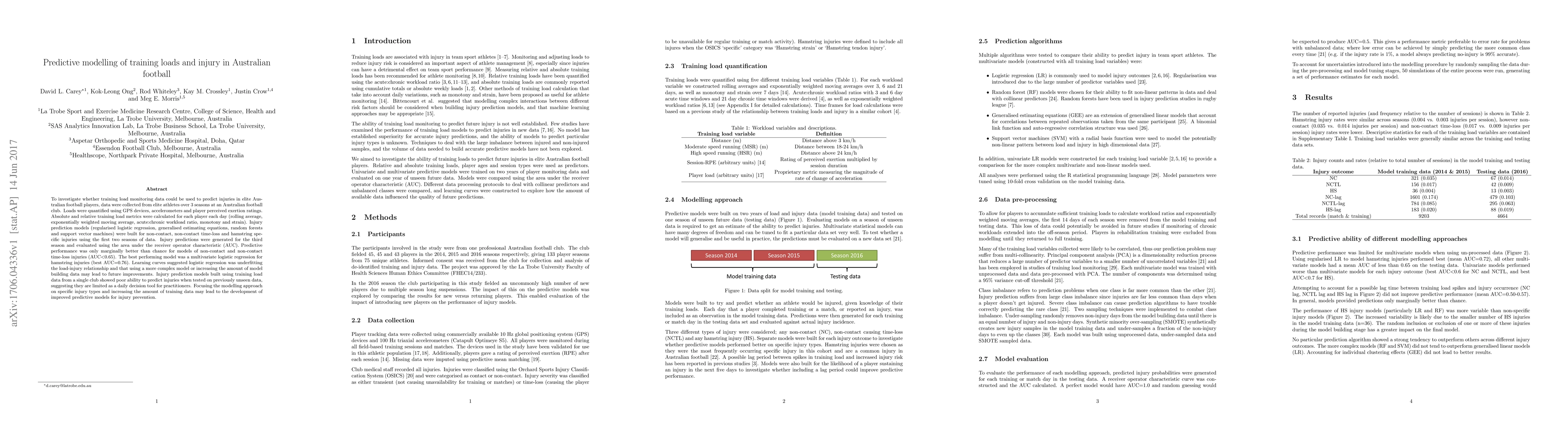 To investigate whether training load monitoring data could be used to predict injuries in elite Australian football players, data were collected from elite athletes over 3 seasons at an Australian football club. Loads were quantified using GPS devices, accelerometers and player perceived exertion ratings. Absolute and relative training load metrics were calculated for each player each day (rolling average, exponentially weighted moving average, acute:chronic workload ratio, monotony and strain). Injury prediction models (regularised logistic regression, generalised estimating equations, random forests and support vector machines) were built for non-contact, non-contact time-loss and hamstring specific injuries using the first two seasons of data. Injury predictions were generated for the third season and evaluated using the area under the receiver operator characteristic (AUC). Predictive performance was only marginally better than chance for models of non-contact and non-contact time-loss injuries (AUC$<$0.65). The best performing model was a multivariate logistic regression for hamstring injuries (best AUC=0.76). Learning curves suggested logistic regression was underfitting the load-injury relationship and that using a more complex model or increasing the amount of model building data may lead to future improvements. Injury prediction models built using training load data from a single club showed poor ability to predict injuries when tested on previously unseen data, suggesting they are limited as a daily decision tool for practitioners. Focusing the modelling approach on specific injury types and increasing the amount of training data may lead to the development of improved predictive models for injury prevention.