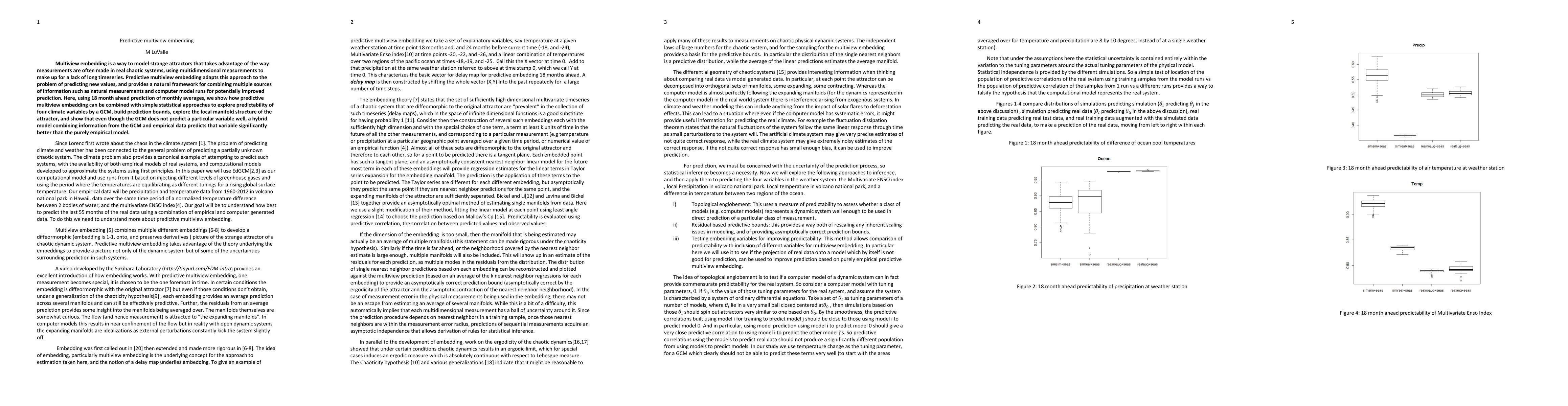 Multiview embedding is a way to model strange attractors that takes advantage of the way measurements are often made in real chaotic systems, using multidimensional measurements to make up for a lack of long timeseries. Predictive multiview embedding adapts this approach to the problem of predicting new values, and provides a natural framework for combining multiple sources of information such as natural measurements and computer model runs for potentially improved prediction. Here, using 18 month ahead prediction of monthly averages, we show how predictive multiview embedding can be combined with simple statistical approaches to explore predictability of four climate variables by a GCM, build prediction bounds, explore the local manifold structure of the attractor, and show that even though the GCM does not predict a particular variable well, a hybrid model combining information from the GCM and empirical data predicts that variable significantly better than the purely empirical model.