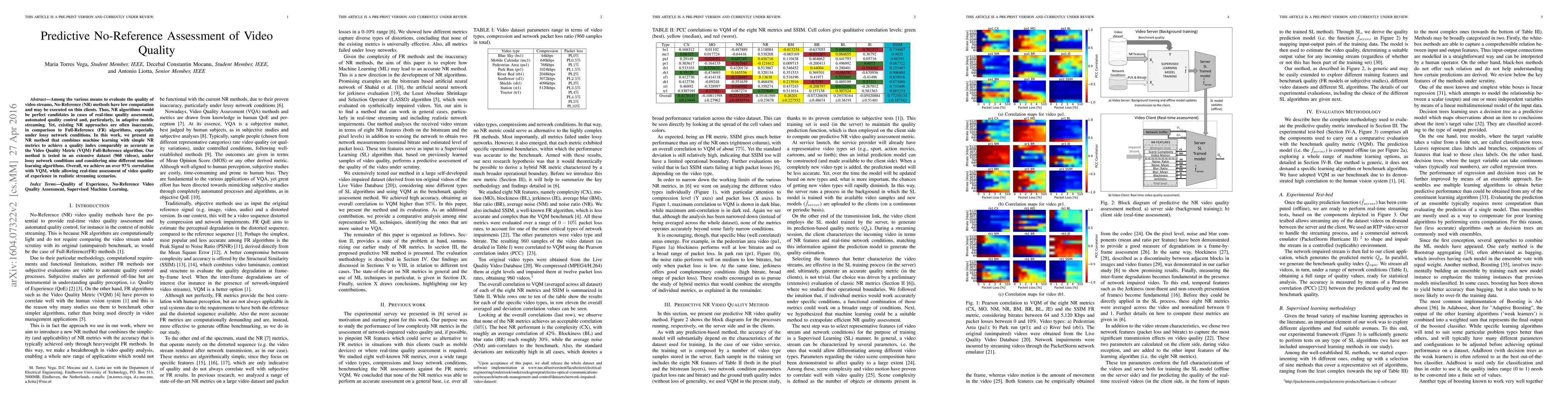 This paper proposes a No-Reference (NR) method combining machine learning with simple NR metrics to achieve high accuracy in video quality assessment, comparable to Full-Reference (FR) algorithms. The method achieves over 97% correlation with the VQM FR algorithm and is suitable for real-time quality assessment in adaptive mobile streaming.