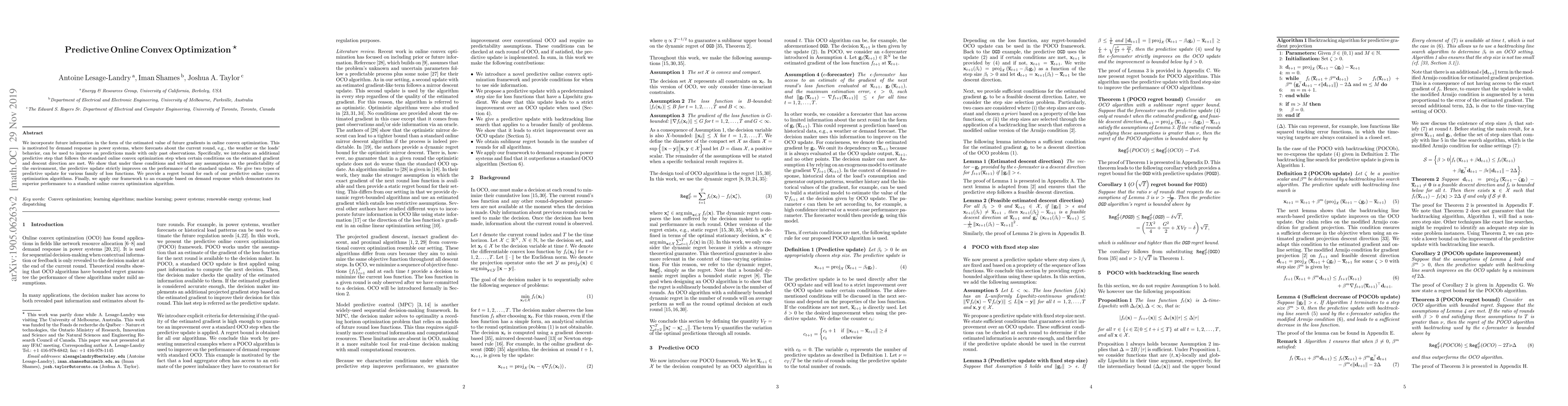 This paper proposes a predictive approach for online convex optimization that leverages future gradient estimates, motivated by demand response applications. It introduces a predictive step that enhances standard updates under certain conditions, demonstrating improved performance and providing regret bounds for its algorithms.