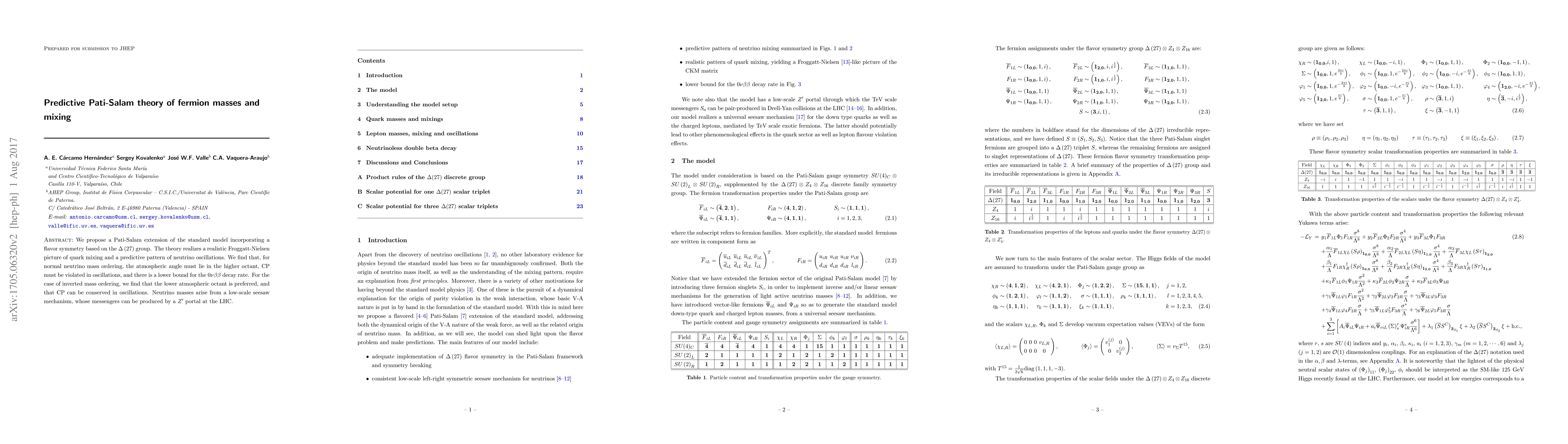We propose a Pati-Salam extension of the standard model incorporating a flavor symmetry based on the $\Delta \left( 27\right)$ group. The theory realizes a realistic Froggatt-Nielsen picture of quark mixing and a predictive pattern of neutrino oscillations. We find that, for normal neutrino mass ordering, the atmospheric angle must lie in the higher octant, CP must be violated in oscillations, and there is a lower bound for the $0\nu\beta\beta$ decay rate. For the case of inverted mass ordering, we find that the lower atmospheric octant is preferred, and that CP can be conserved in oscillations. Neutrino masses arise from a low-scale seesaw mechanism, whose messengers can be produced by a $Z^{\prime }$ portal at the LHC.