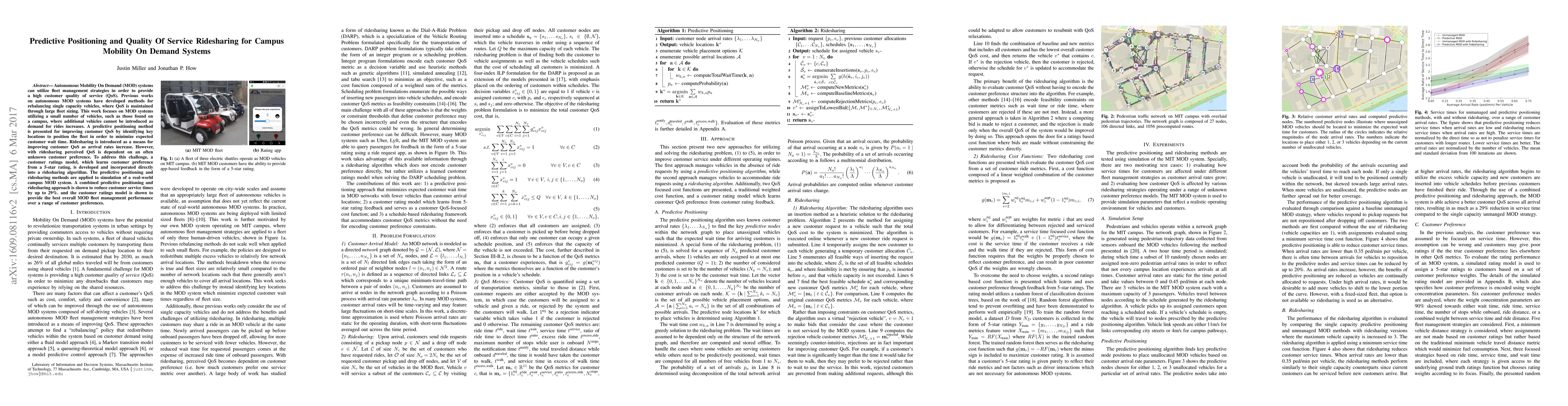 Autonomous Mobility On Demand (MOD) systems can utilize fleet management strategies in order to provide a high customer quality of service (QoS). Previous works on autonomous MOD systems have developed methods for rebalancing single capacity vehicles, where QoS is maintained through large fleet sizing. This work focuses on MOD systems utilizing a small number of vehicles, such as those found on a campus, where additional vehicles cannot be introduced as demand for rides increases. A predictive positioning method is presented for improving customer QoS by identifying key locations to position the fleet in order to minimize expected customer wait time. Ridesharing is introduced as a means for improving customer QoS as arrival rates increase. However, with ridesharing perceived QoS is dependent on an often unknown customer preference. To address this challenge, a customer ratings model, which learns customer preference from a 5-star rating, is developed and incorporated directly into a ridesharing algorithm. The predictive positioning and ridesharing methods are applied to simulation of a real-world campus MOD system.A combined predictive positioning and ridesharing approach is shown to reduce customer service times by up to 29% and the customer ratings model is shown to provide the best overall MOD fleet management performance over a range of customer preferences.