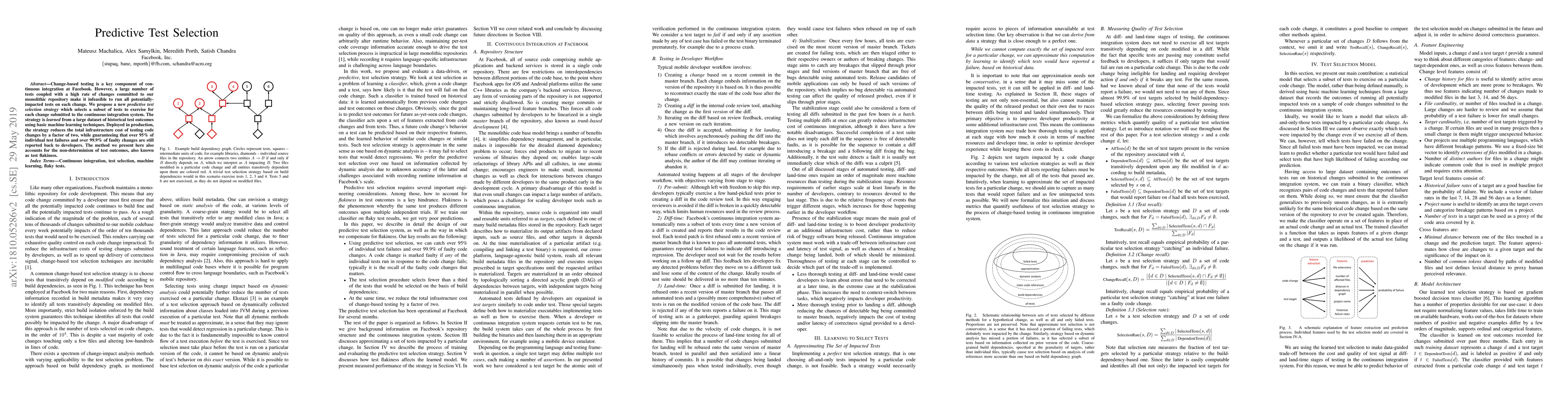Change-based testing is a key component of continuous integration at Facebook. However, a large number of tests coupled with a high rate of changes committed to our monolithic repository make it infeasible to run all potentially-impacted tests on each change. We propose a new predictive test selection strategy which selects a subset of tests to exercise for each change submitted to the continuous integration system. The strategy is learned from a large dataset of historical test outcomes using basic machine learning techniques. Deployed in production, the strategy reduces the total infrastructure cost of testing code changes by a factor of two, while guaranteeing that over 95% of individual test failures and over 99.9% of faulty changes are still reported back to developers. The method we present here also accounts for the non-determinism of test outcomes, also known as test flakiness.