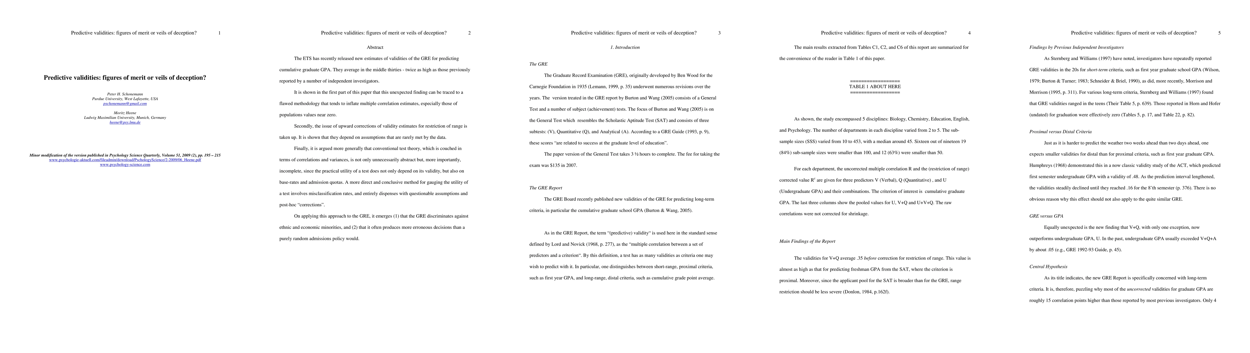 The ETS has recently released new estimates of validities of the GRE for predicting cumulative graduate GPA. They average in the middle thirties - twice as high as those previously reported by a number of independent investigators. It is shown in the first part of this paper that this unexpected finding can be traced to a flawed methodology that tends to inflate multiple correlation estimates, especially those of populations values near zero. Secondly, the issue of upward corrections of validity estimates for restriction of range is taken up. It is shown that they depend on assumptions that are rarely met by the data. Finally, it is argued more generally that conventional test theory, which is couched in terms of correlations and variances, is not only unnecessarily abstract but, more importantly, incomplete, since the practical utility of a test does not only depend on its validity, but also on base-rates and admission quotas. A more direct and conclusive method for gauging the utility of a test involves misclassification rates, and entirely dispenses with questionable assumptions and post-hoc "corrections". On applying this approach to the GRE, it emerges (1) that the GRE discriminates against ethnic and economic minorities, and (2) that it often produces more erroneous decisions than a purely random admissions policy would.