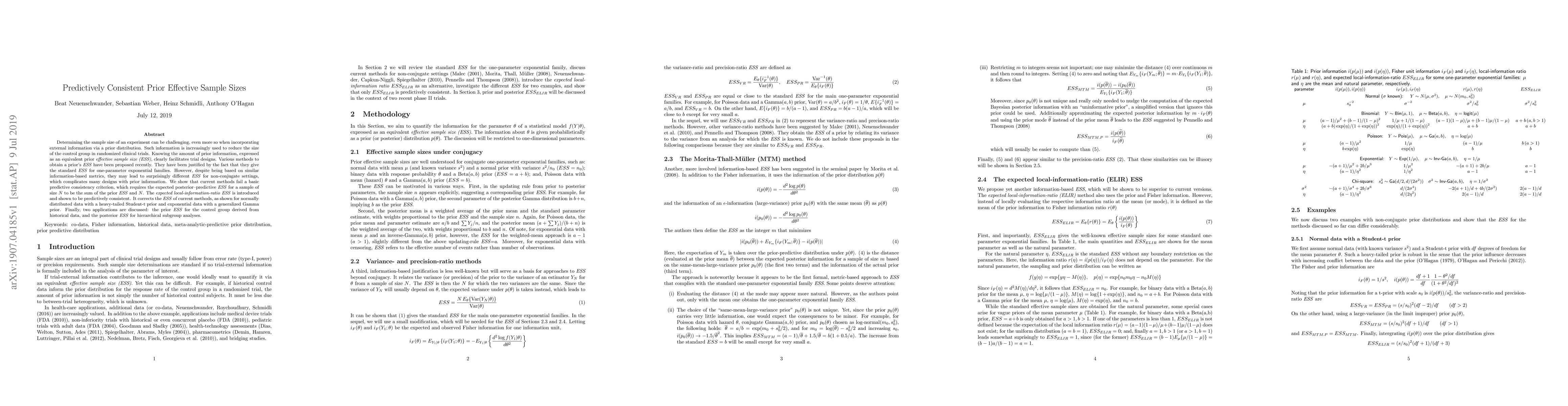Determining the sample size of an experiment can be challenging, even more so when incorporating external information via a prior distribution. Such information is increasingly used to reduce the size of the control group in randomized clinical trials. Knowing the amount of prior information, expressed as an equivalent prior effective sample size (ESS), clearly facilitates trial designs. Various methods to obtain a prior's ESS have been proposed recently. They have been justified by the fact that they give the standard ESS for one-parameter exponential families. However, despite being based on similar information-based metrics, they may lead to surprisingly different ESS for non-conjugate settings, which complicates many designs with prior information. We show that current methods fail a basic predictive consistency criterion, which requires the expected posterior-predictive ESS for a sample of size $N$ to be the sum of the prior ESS and $N$. The expected local-information-ratio ESS is introduced and shown to be predictively consistent. It corrects the ESS of current methods, as shown for normally distributed data with a heavy-tailed Student-t prior and exponential data with a generalized Gamma prior. Finally, two applications are discussed: the prior ESS for the control group derived from historical data, and the posterior ESS for hierarchical subgroup analyses.