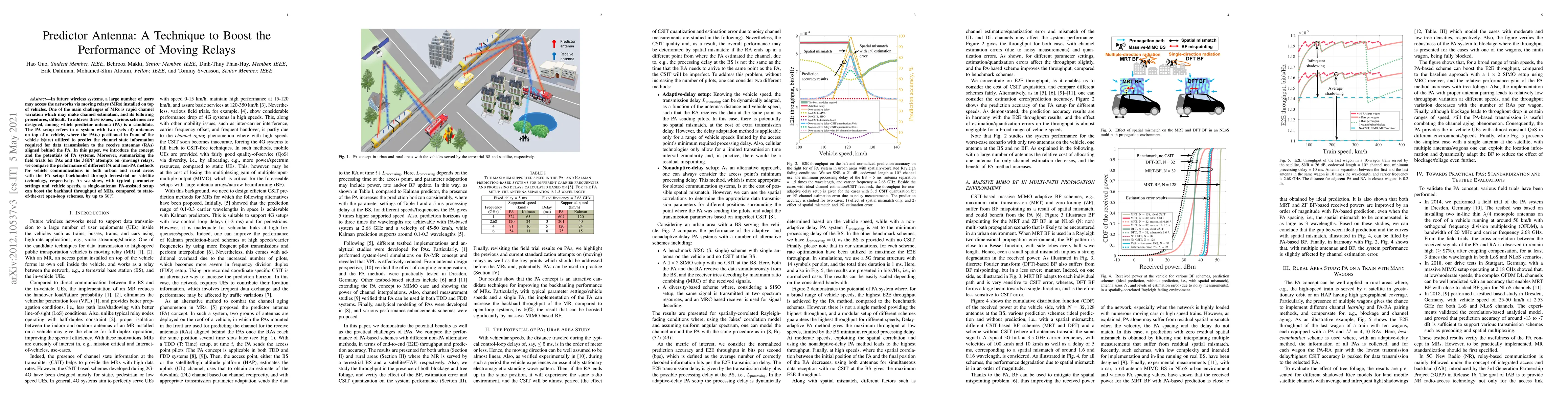 The paper introduces the concept of predictor antenna (PA) systems to enhance the performance of moving relays in future wireless networks, addressing rapid channel variations. Field trials and comparisons show that PA setups can increase backhaul throughput by up to 50% compared to non-PA methods.