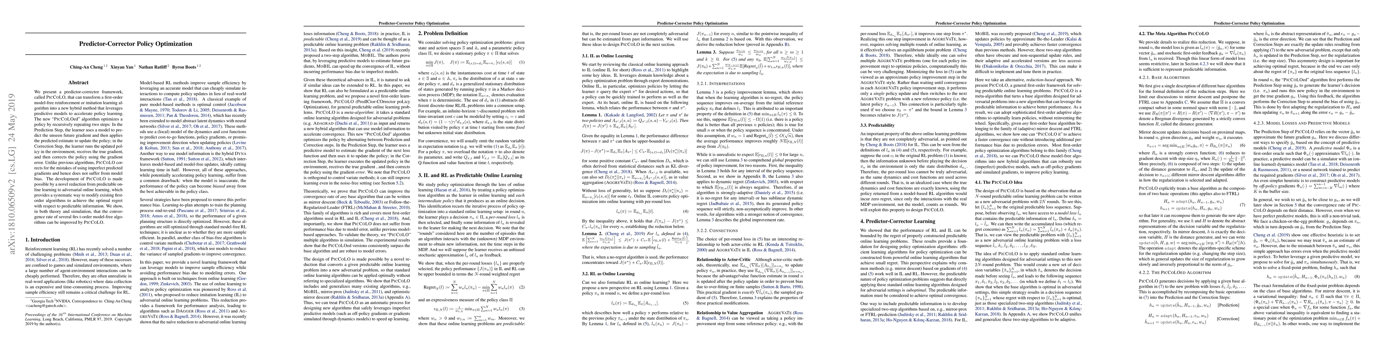 We present a predictor-corrector framework, called PicCoLO, that can transform a first-order model-free reinforcement or imitation learning algorithm into a new hybrid method that leverages predictive models to accelerate policy learning. The new "PicCoLOed" algorithm optimizes a policy by recursively repeating two steps: In the Prediction Step, the learner uses a model to predict the unseen future gradient and then applies the predicted estimate to update the policy; in the Correction Step, the learner runs the updated policy in the environment, receives the true gradient, and then corrects the policy using the gradient error. Unlike previous algorithms, PicCoLO corrects for the mistakes of using imperfect predicted gradients and hence does not suffer from model bias. The development of PicCoLO is made possible by a novel reduction from predictable online learning to adversarial online learning, which provides a systematic way to modify existing first-order algorithms to achieve the optimal regret with respect to predictable information. We show, in both theory and simulation, that the convergence rate of several first-order model-free algorithms can be improved by PicCoLO.