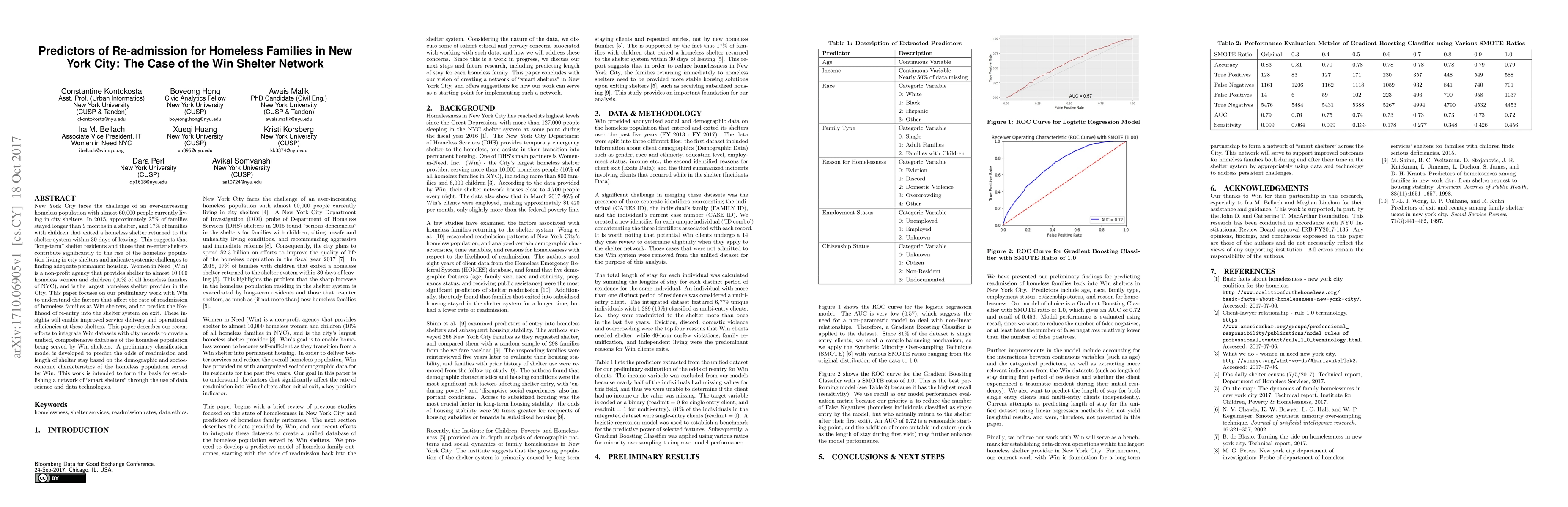 New York City faces the challenge of an ever-increasing homeless population with almost 60,000 people currently living in city shelters. In 2015, approximately 25% of families stayed longer than 9 months in a shelter, and 17% of families with children that exited a homeless shelter returned to the shelter system within 30 days of leaving. This suggests that "long-term" shelter residents and those that re-enter shelters contribute significantly to the rise of the homeless population living in city shelters and indicate systemic challenges to finding adequate permanent housing. Women in Need (Win) is a non-profit agency that provides shelter to almost 10,000 homeless women and children (10% of all homeless families of NYC), and is the largest homeless shelter provider in the City. This paper focuses on our preliminary work with Win to understand the factors that affect the rate of readmission of homeless families at Win shelters, and to predict the likelihood of re-entry into the shelter system on exit. These insights will enable improved service delivery and operational efficiencies at these shelters. This paper describes our recent efforts to integrate Win datasets with city records to create a unified, comprehensive database of the homeless population being served by Win shelters. A preliminary classification model is developed to predict the odds of readmission and length of shelter stay based on the demographic and socioeconomic characteristics of the homeless population served by Win. This work is intended to form the basis for establishing a network of "smart shelters" through the use of data science and data technologies.