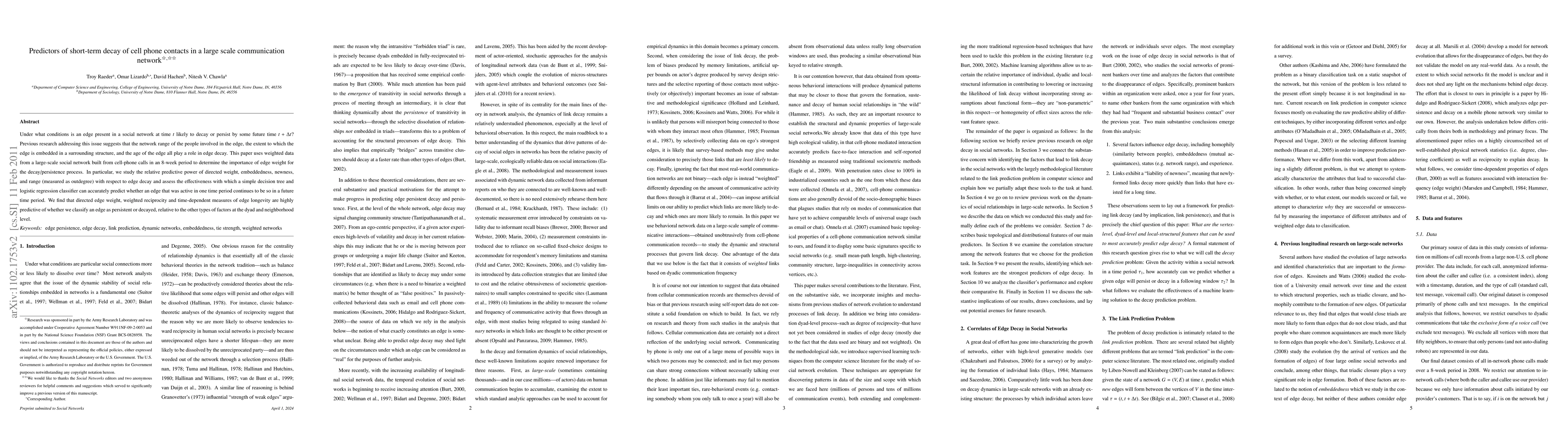 Under what conditions is an edge present in a social network at time t likely to decay or persist by some future time t + Delta(t)? Previous research addressing this issue suggests that the network range of the people involved in the edge, the extent to which the edge is embedded in a surrounding structure, and the age of the edge all play a role in edge decay. This paper uses weighted data from a large-scale social network built from cell-phone calls in an 8-week period to determine the importance of edge weight for the decay/persistence process. In particular, we study the relative predictive power of directed weight, embeddedness, newness, and range (measured as outdegree) with respect to edge decay and assess the effectiveness with which a simple decision tree and logistic regression classifier can accurately predict whether an edge that was active in one time period continues to be so in a future time period. We find that directed edge weight, weighted reciprocity and time-dependent measures of edge longevity are highly predictive of whether we classify an edge as persistent or decayed, relative to the other types of factors at the dyad and neighborhood level.