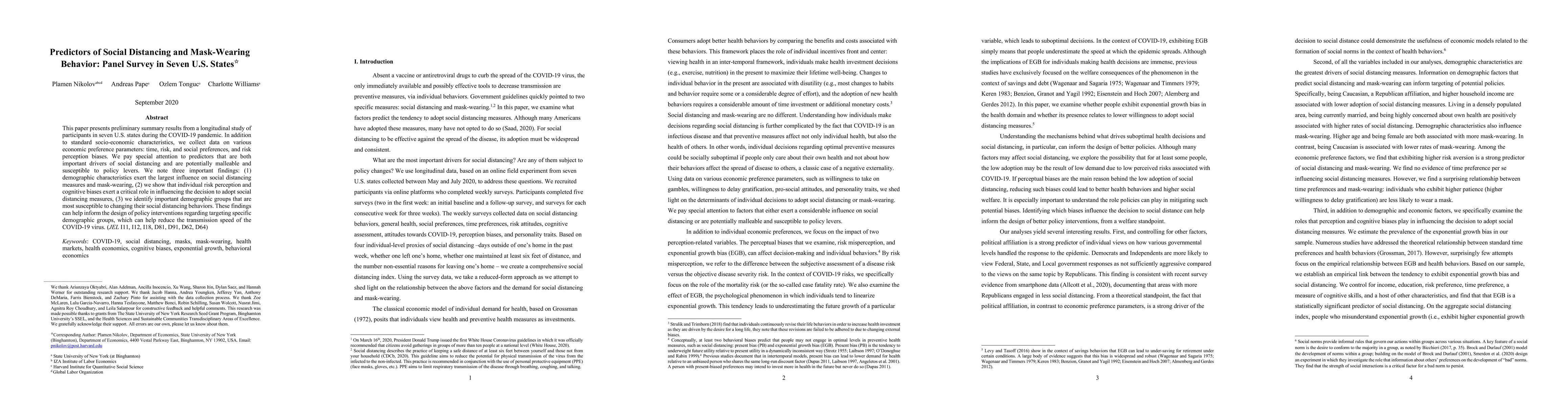 This paper presents preliminary summary results from a longitudinal study of participants in seven U.S. states during the COVID-19 pandemic. In addition to standard socio-economic characteristics, we collect data on various economic preference parameters: time, risk, and social preferences, and risk perception biases. We pay special attention to predictors that are both important drivers of social distancing and are potentially malleable and susceptible to policy levers. We note three important findings: (1) demographic characteristics exert the largest influence on social distancing measures and mask-wearing, (2) we show that individual risk perception and cognitive biases exert a critical role in influencing the decision to adopt social distancing measures, (3) we identify important demographic groups that are most susceptible to changing their social distancing behaviors. These findings can help inform the design of policy interventions regarding targeting specific demographic groups, which can help reduce the transmission speed of the COVID-19 virus.