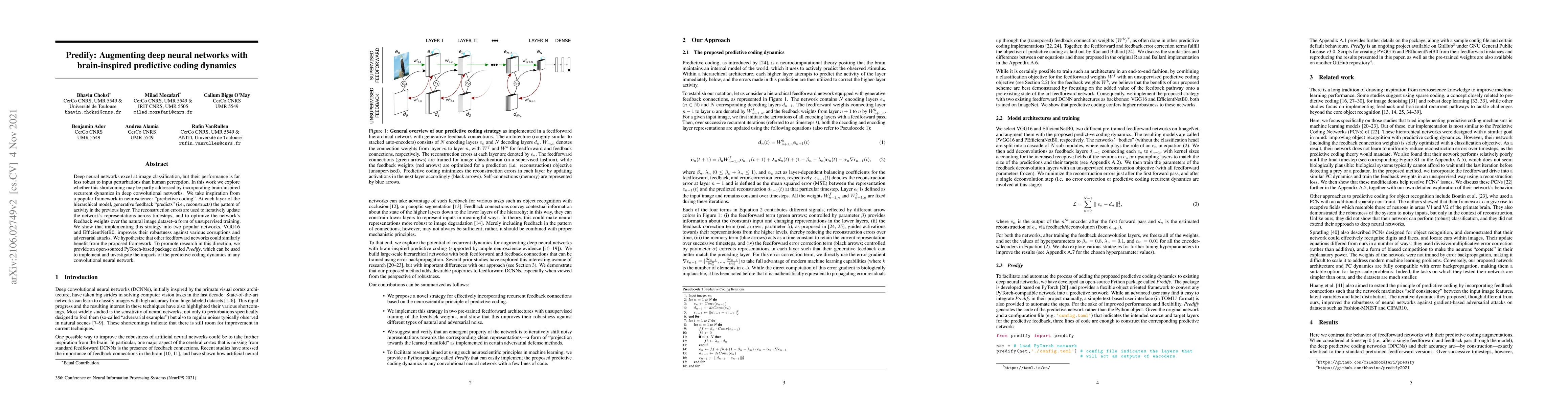Deep neural networks excel at image classification, but their performance is far less robust to input perturbations than human perception. In this work we explore whether this shortcoming may be partly addressed by incorporating brain-inspired recurrent dynamics in deep convolutional networks. We take inspiration from a popular framework in neuroscience: 'predictive coding'. At each layer of the hierarchical model, generative feedback 'predicts' (i.e., reconstructs) the pattern of activity in the previous layer. The reconstruction errors are used to iteratively update the network's representations across timesteps, and to optimize the network's feedback weights over the natural image dataset-a form of unsupervised training. We show that implementing this strategy into two popular networks, VGG16 and EfficientNetB0, improves their robustness against various corruptions and adversarial attacks. We hypothesize that other feedforward networks could similarly benefit from the proposed framework. To promote research in this direction, we provide an open-sourced PyTorch-based package called Predify, which can be used to implement and investigate the impacts of the predictive coding dynamics in any convolutional neural network.
