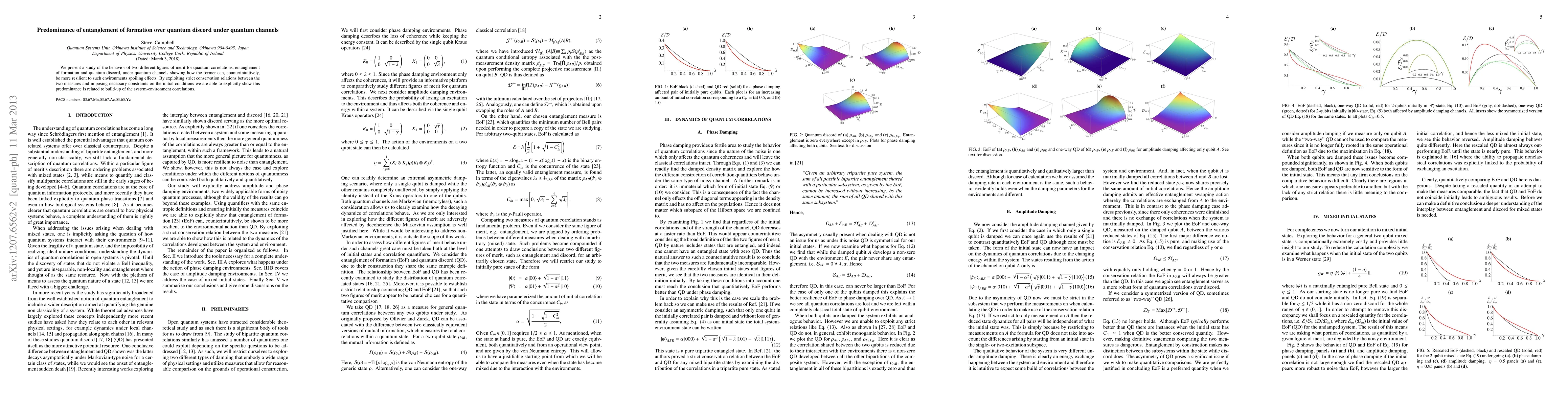 We present a study of the behavior of two different figures of merit for quantum correlations, entanglement of formation and quantum discord, under quantum channels showing how the former can, counterintuitively, be more resilient to such environments spoiling effects. By exploiting strict conservation relations between the two measures and imposing necessary constraints on the initial conditions we are able to explicitly show this predominance is related to build-up of the system-environment correlations.