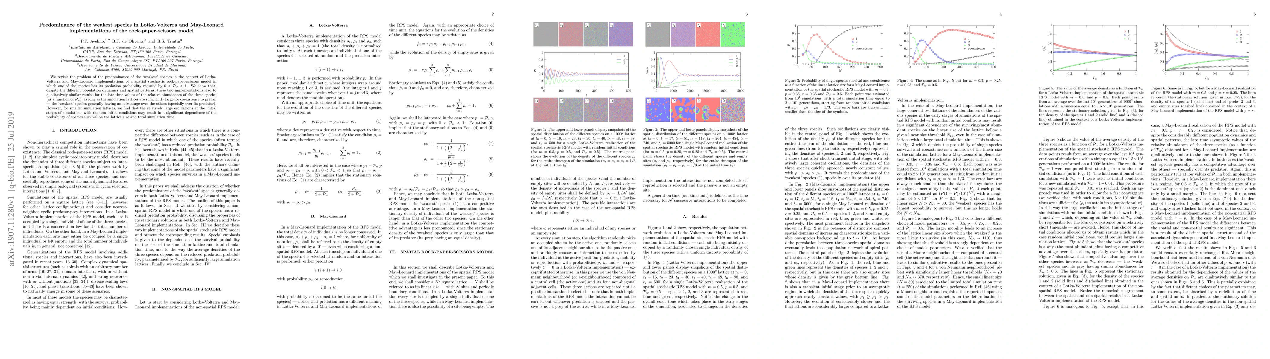 A study on a rock-paper-scissors model found that even with different population dynamics and spatial patterns, the weakest species often prevails over others, especially its predator, in large simulation lattices.