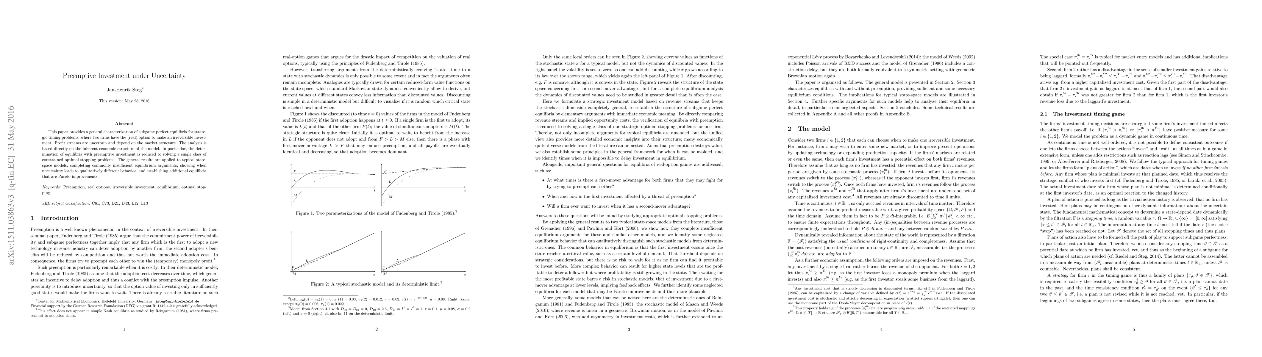 This paper characterizes subgame perfect equilibria for strategic timing problems involving two firms with irreversible investment options under uncertain profit streams. It reduces the determination of preemptive investment equilibria to solving constrained optimal stopping problems, revealing additional Pareto-improving equilibria and explaining how uncertainty affects market behavior.