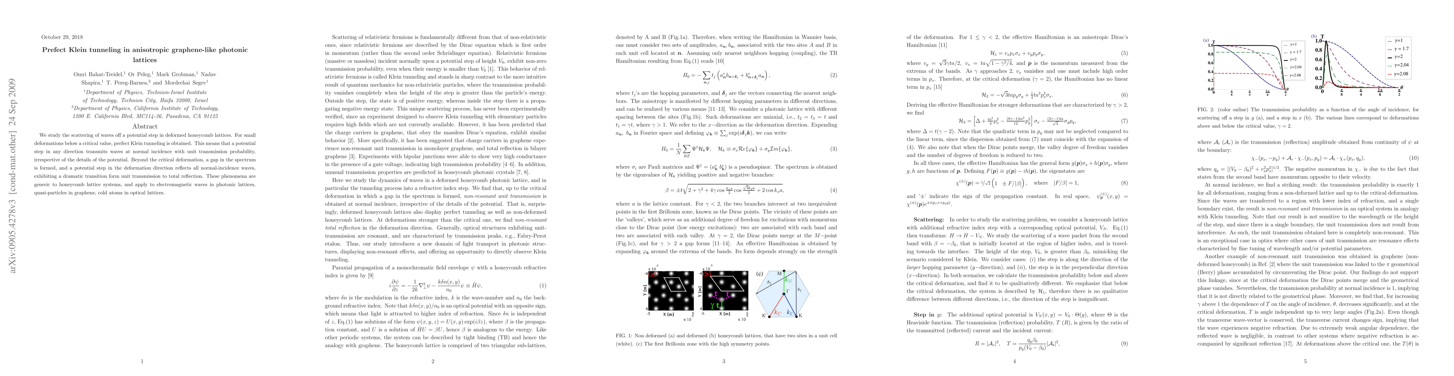 This research investigates wave scattering in deformed honeycomb lattices, showing perfect Klein tunneling for small deformations where waves transmit completely through potential steps. Beyond a critical deformation, a spectrum gap forms, causing total reflection in the deformation direction, highlighting a transition from perfect transmission to complete reflection.