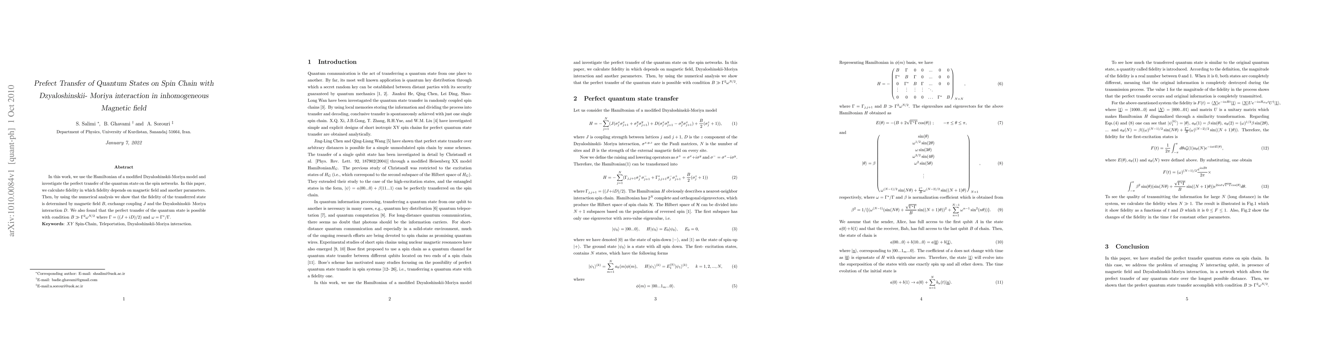 This paper investigates the perfect transfer of quantum states on spin chains using a modified Dzyaloshinskii-Moriya model under an inhomogeneous magnetic field. The study finds that fidelity, which depends on the magnetic field and other parameters, is determined by the field strength $B$, exchange coupling $J$, and Dzyaloshinskii-Moriya interaction $D$, with perfect transfer achievable under the condition $B \gg \Gamma^2\omega^{N/2}$.