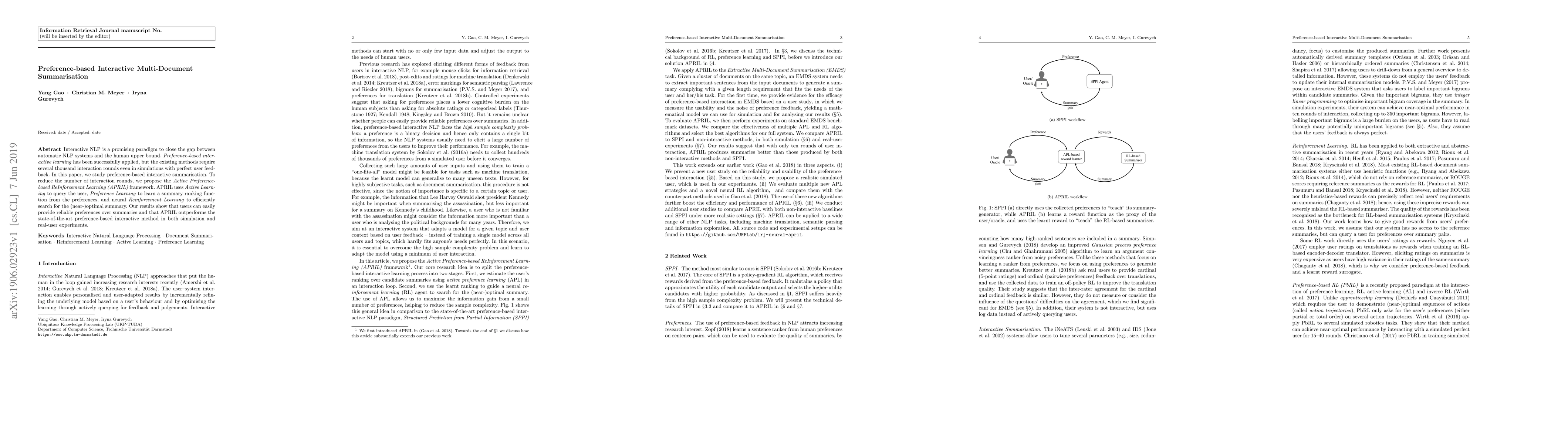 This paper introduces the Active Preference-based ReInforcement Learning (APRIL) framework to enhance preference-based interactive multi-document summarization. APRIL reduces interaction rounds by combining Active Learning, Preference Learning, and neural Reinforcement Learning, outperforming existing methods in both simulated and real-user evaluations.