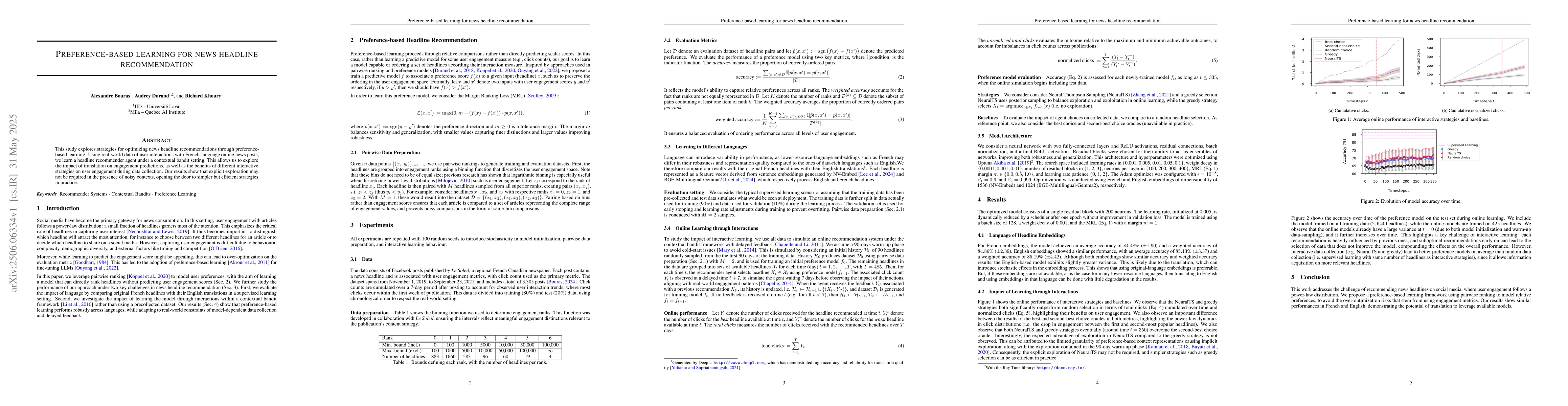 This study explores strategies for optimizing news headline recommendations through preference-based learning. Using real-world data of user interactions with French-language online news posts, we learn a headline recommender agent under a contextual bandit setting. This allows us to explore the impact of translation on engagement predictions, as well as the benefits of different interactive strategies on user engagement during data collection. Our results show that explicit exploration may not be required in the presence of noisy contexts, opening the door to simpler but efficient strategies in practice.