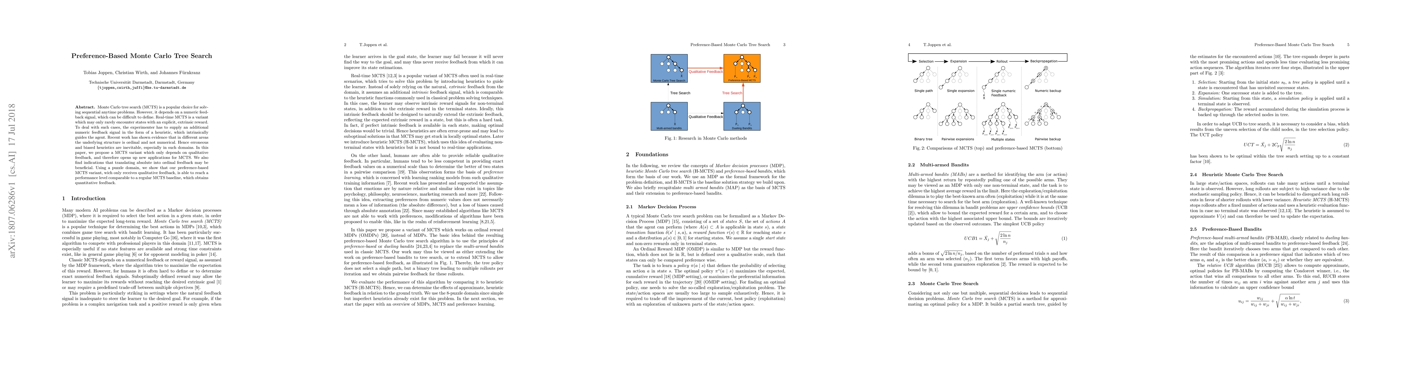 This paper proposes a preference-based variant of Monte Carlo Tree Search (MCTS) that relies solely on qualitative feedback instead of numeric rewards, addressing the challenge of defining heuristics in real-time scenarios. The method demonstrates comparable performance to traditional MCTS using quantitative feedback, indicating potential for broader applications.