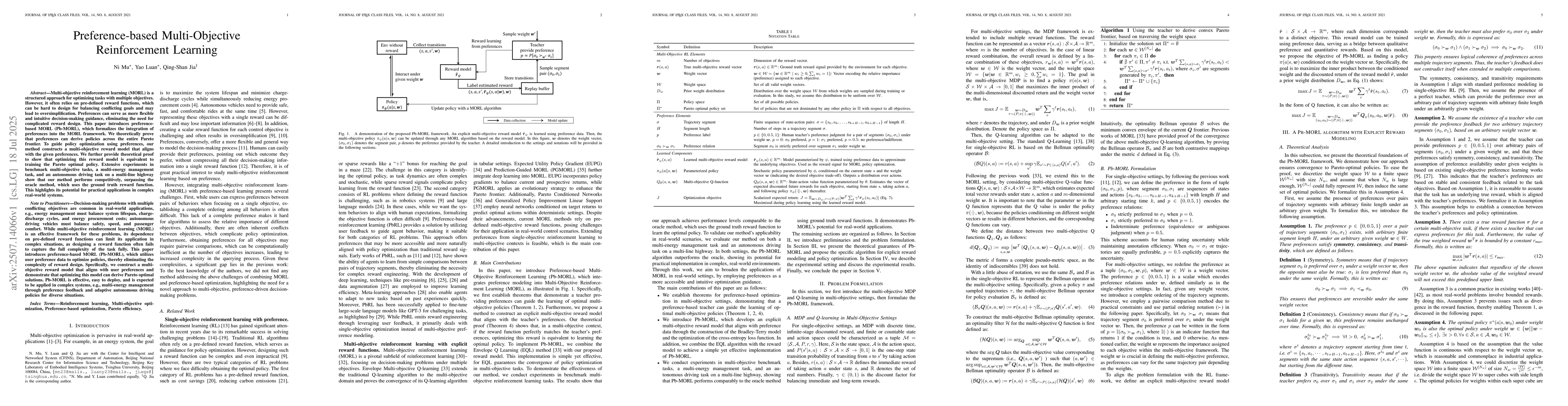 Multi-objective reinforcement learning (MORL) is a structured approach for optimizing tasks with multiple objectives. However, it often relies on pre-defined reward functions, which can be hard to design for balancing conflicting goals and may lead to oversimplification. Preferences can serve as more flexible and intuitive decision-making guidance, eliminating the need for complicated reward design. This paper introduces preference-based MORL (Pb-MORL), which formalizes the integration of preferences into the MORL framework. We theoretically prove that preferences can derive policies across the entire Pareto frontier. To guide policy optimization using preferences, our method constructs a multi-objective reward model that aligns with the given preferences. We further provide theoretical proof to show that optimizing this reward model is equivalent to training the Pareto optimal policy. Extensive experiments in benchmark multi-objective tasks, a multi-energy management task, and an autonomous driving task on a multi-line highway show that our method performs competitively, surpassing the oracle method, which uses the ground truth reward function. This highlights its potential for practical applications in complex real-world systems.