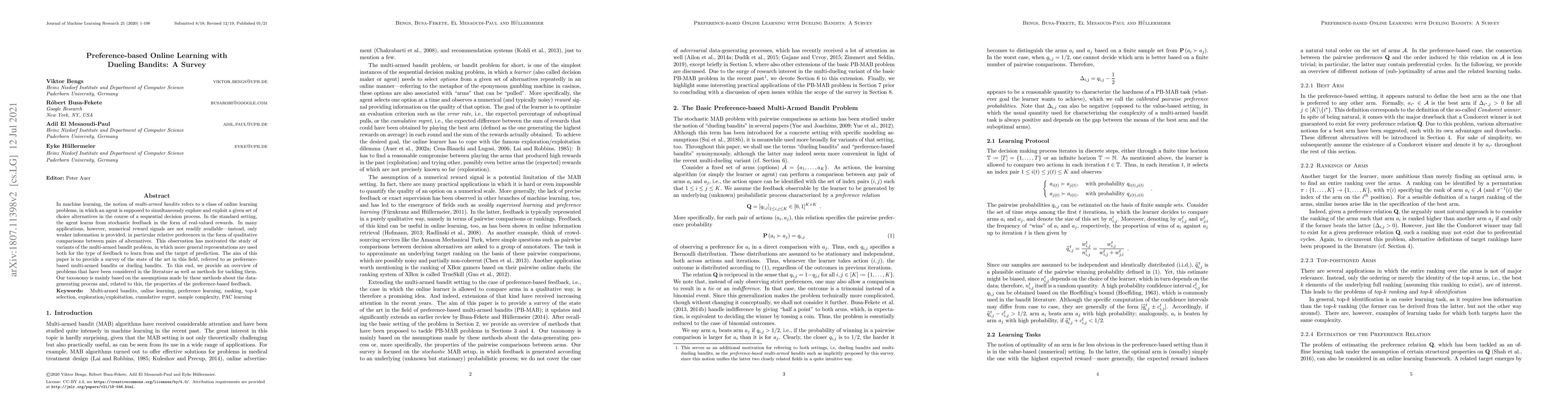 In machine learning, the notion of multi-armed bandits refers to a class of online learning problems, in which an agent is supposed to simultaneously explore and exploit a given set of choice alternatives in the course of a sequential decision process. In the standard setting, the agent learns from stochastic feedback in the form of real-valued rewards. In many applications, however, numerical reward signals are not readily available -- instead, only weaker information is provided, in particular relative preferences in the form of qualitative comparisons between pairs of alternatives. This observation has motivated the study of variants of the multi-armed bandit problem, in which more general representations are used both for the type of feedback to learn from and the target of prediction. The aim of this paper is to provide a survey of the state of the art in this field, referred to as preference-based multi-armed bandits or dueling bandits. To this end, we provide an overview of problems that have been considered in the literature as well as methods for tackling them. Our taxonomy is mainly based on the assumptions made by these methods about the data-generating process and, related to this, the properties of the preference-based feedback.