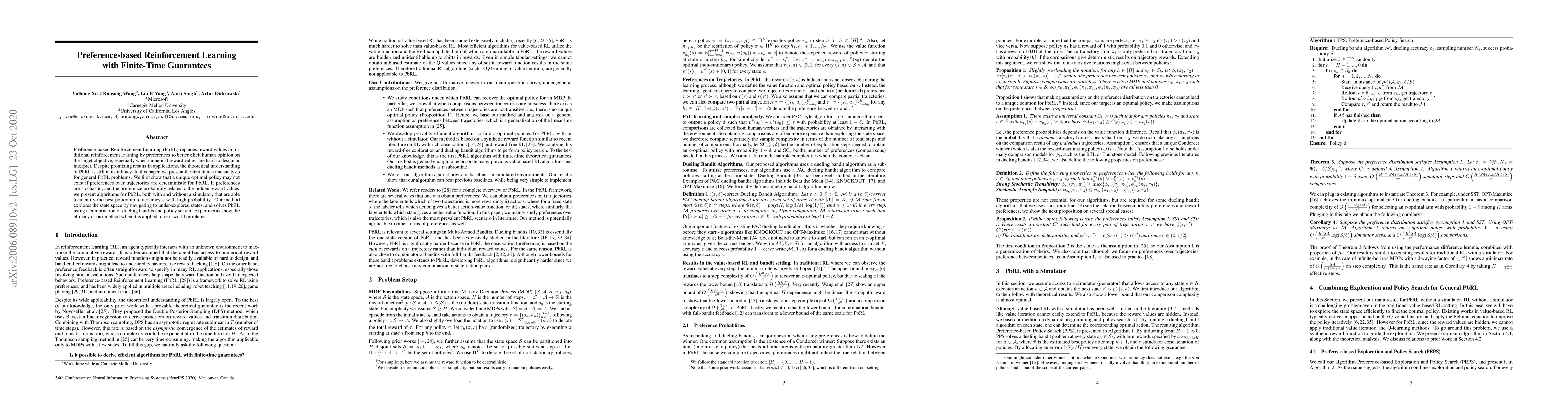 Preference-based Reinforcement Learning (PbRL) replaces reward values in traditional reinforcement learning by preferences to better elicit human opinion on the target objective, especially when numerical reward values are hard to design or interpret. Despite promising results in applications, the theoretical understanding of PbRL is still in its infancy. In this paper, we present the first finite-time analysis for general PbRL problems. We first show that a unique optimal policy may not exist if preferences over trajectories are deterministic for PbRL. If preferences are stochastic, and the preference probability relates to the hidden reward values, we present algorithms for PbRL, both with and without a simulator, that are able to identify the best policy up to accuracy $\varepsilon$ with high probability. Our method explores the state space by navigating to under-explored states, and solves PbRL using a combination of dueling bandits and policy search. Experiments show the efficacy of our method when it is applied to real-world problems.