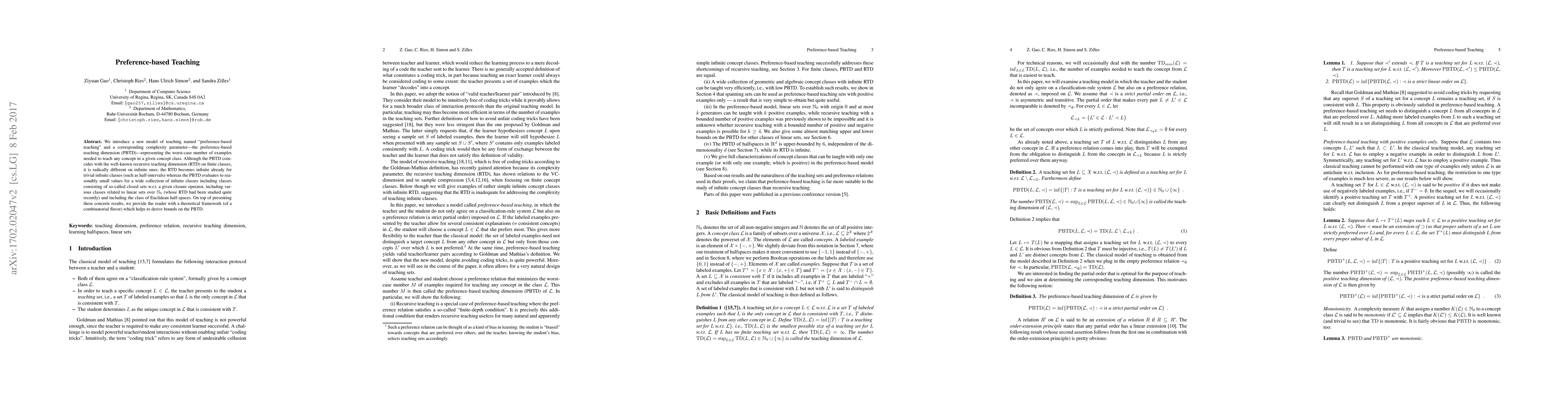 This paper introduces "preference-based teaching" and its complexity parameter, the preference-based teaching dimension (PBTD), which measures the worst-case number of examples needed to teach any concept in a concept class. Unlike the recursive teaching dimension (RTD), PBTD yields finite values for many infinite classes, offering a more practical approach.