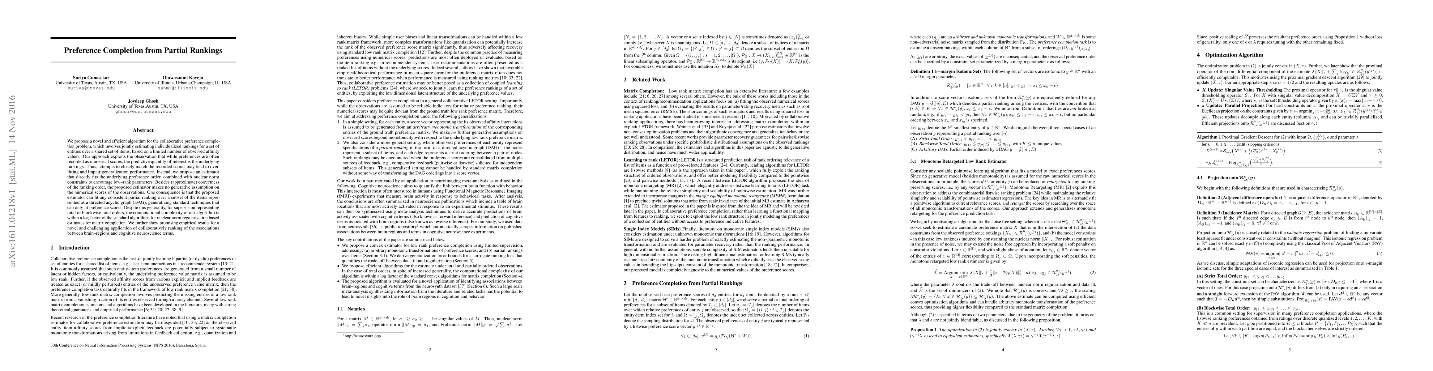 This paper proposes an efficient algorithm for collaborative preference completion, focusing on estimating rankings from limited affinity values rather than exact scores to avoid overfitting. The method fits underlying preference orders with nuclear norm constraints, generalizing beyond standard preference score techniques.