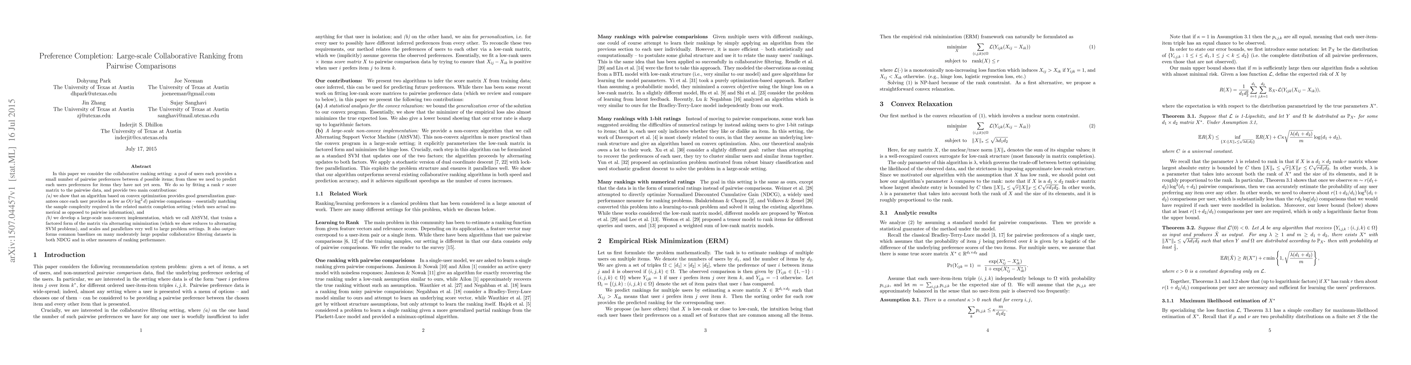 This paper presents a method for large-scale collaborative ranking using pairwise comparisons, showing that convex optimization can generalize well with minimal data. It also introduces AltSVM, a scalable non-convex algorithm that outperforms baselines on ranking performance metrics.