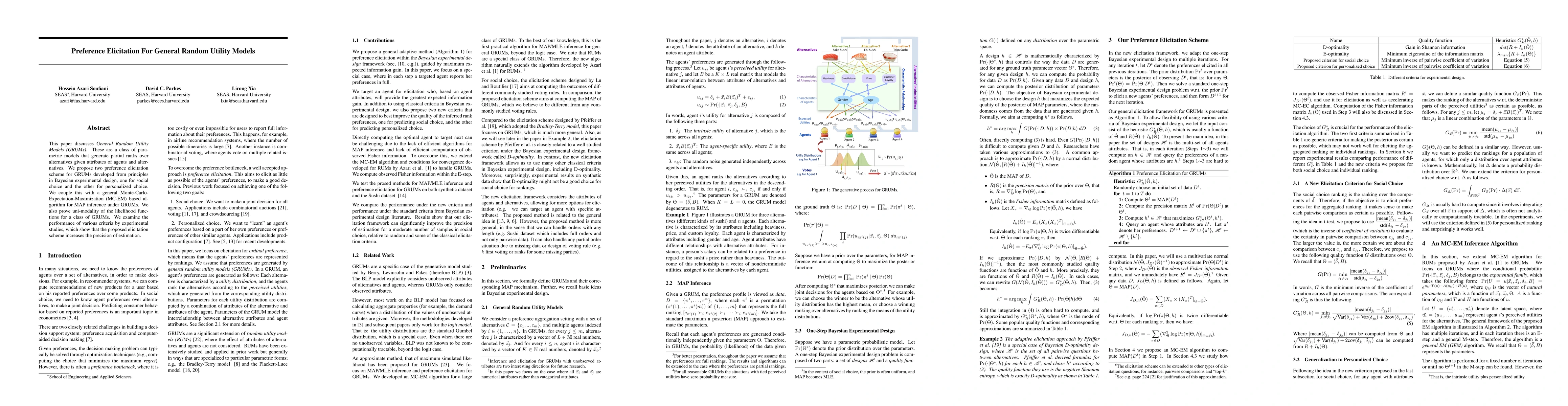 This paper proposes two preference elicitation schemes for General Random Utility Models (GRUMs) based on Bayesian experimental design, along with a Monte-Carlo-Expectation-Maximization algorithm for MAP inference, demonstrating improved estimation precision through experimental studies. It also proves uni-modality of likelihood functions for a class of GRUMs.