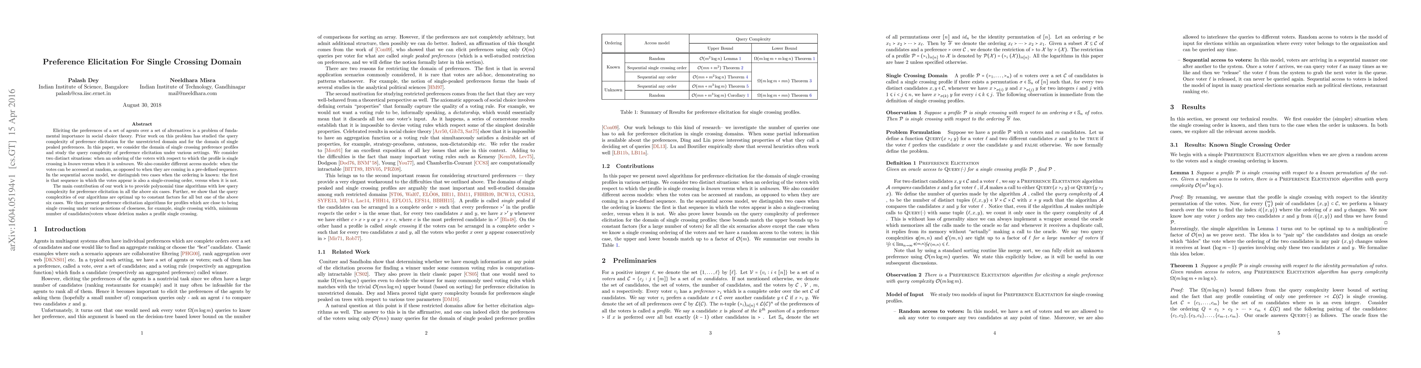 This paper develops polynomial time algorithms with low query complexity for eliciting preferences in single crossing domains under various conditions, including known and unknown orderings of voters and different access models. The authors demonstrate optimal query complexity for most scenarios and also address profiles close to being single crossing.