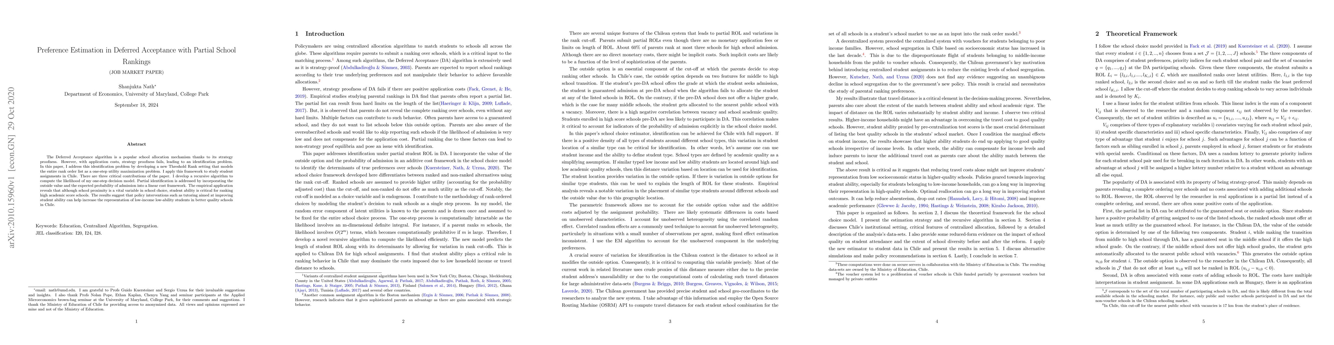 This paper develops a new Threshold Rank setting to address the identification problem in the Deferred Acceptance algorithm when strategy proofness fails due to application costs. It introduces a recursive algorithm for likelihood computation and shows that student ability, rather than just proximity, is crucial for ranking high-quality schools, suggesting policy interventions like tutoring can improve low-income students' access to better schools.