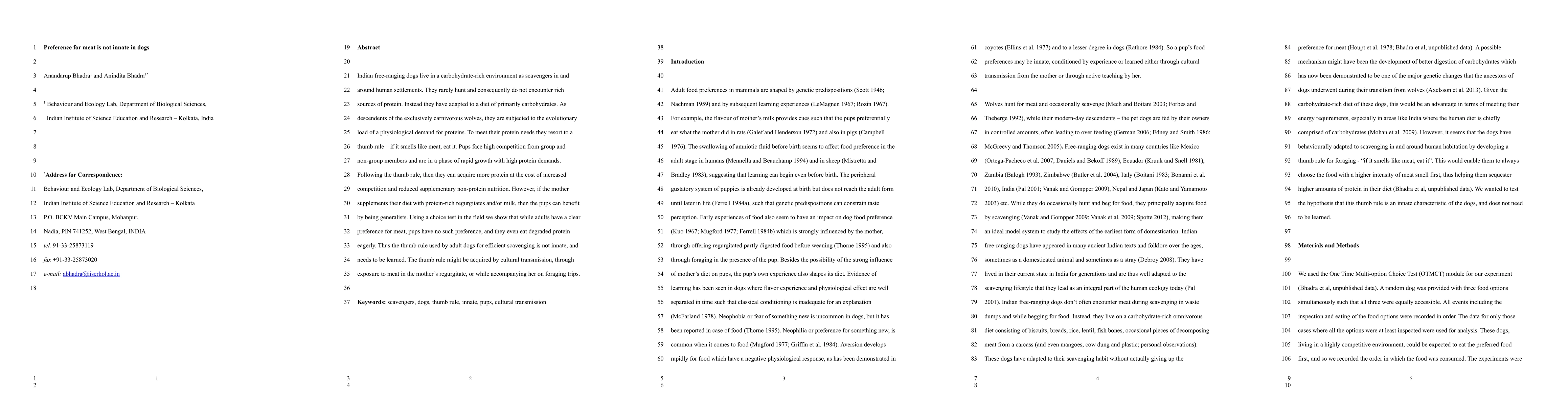 Indian free ranging dogs live in a carbohydrate rich environment as scavengers in and around human settlements. They rarely hunt and consequently do not encounter rich sources of protein. Instead they have adapted to a diet of primarily carbohydrates. As descendants of the exclusively carnivorous wolves, they are subjected to the evolutionary load of a physiological demand for proteins. To meet their protein needs they resort to a thumb rule, if it smells like meat, eat it. Pups face high competition from group and non group members and are in a phase of rapid growth with high protein demands. Following the thumb rule, then they can acquire more protein at the cost of increased competition and reduced supplementary non protein nutrition. However, if the mother supplements their diet with protein rich regurgitates and milk, then the pups can benefit by being generalists. Using a choice test in the field we show that while adults have a clear preference for meat, pups have no such preference, and they even eat degraded protein eagerly. Thus the thumb rule used by adult dogs for efficient scavenging is not innate, and needs to be learned. The thumb rule might be acquired by cultural transmission, through exposure to meat in the regurgitate of the mother, or while accompanying her on foraging trips.