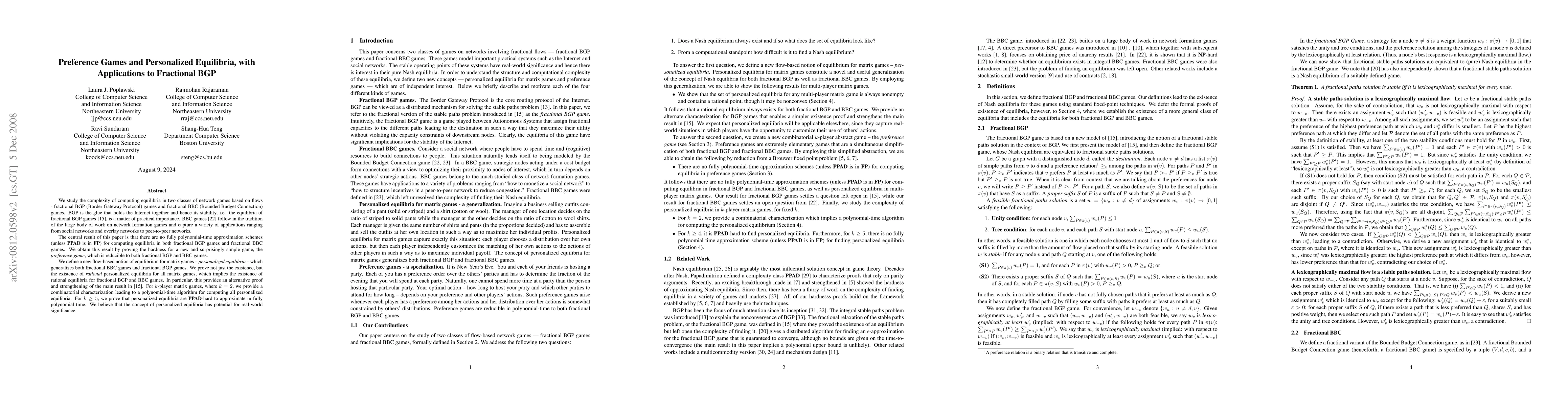 We study the complexity of computing equilibria in two classes of network games based on flows - fractional BGP (Border Gateway Protocol) games and fractional BBC (Bounded Budget Connection) games. BGP is the glue that holds the Internet together and hence its stability, i.e. the equilibria of fractional BGP games (Haxell, Wilfong), is a matter of practical importance. BBC games (Laoutaris et al) follow in the tradition of the large body of work on network formation games and capture a variety of applications ranging from social networks and overlay networks to peer-to-peer networks. The central result of this paper is that there are no fully polynomial-time approximation schemes (unless PPAD is in FP) for computing equilibria in both fractional BGP games and fractional BBC games. We obtain this result by proving the hardness for a new and surprisingly simple game, the fractional preference game, which is reducible to both fractional BGP and BBC games. We define a new flow-based notion of equilibrium for matrix games -- personalized equilibria -- generalizing both fractional BBC and fractional BGP games. We prove not just the existence, but the existence of rational personalized equilibria for all matrix games, which implies the existence of rational equilibria for fractional BGP and BBC games. In particular, this provides an alternative proof and strengthening of the main result in [Haxell, Wilfong]. For k-player matrix games, where k = 2, we provide a combinatorial characterization leading to a polynomial-time algorithm for computing all personalized equilibria. For k >= 5, we prove that personalized equilibria are PPAD-hard to approximate in fully polynomial time. We believe that the concept of personalized equilibria has potential for real-world significance.