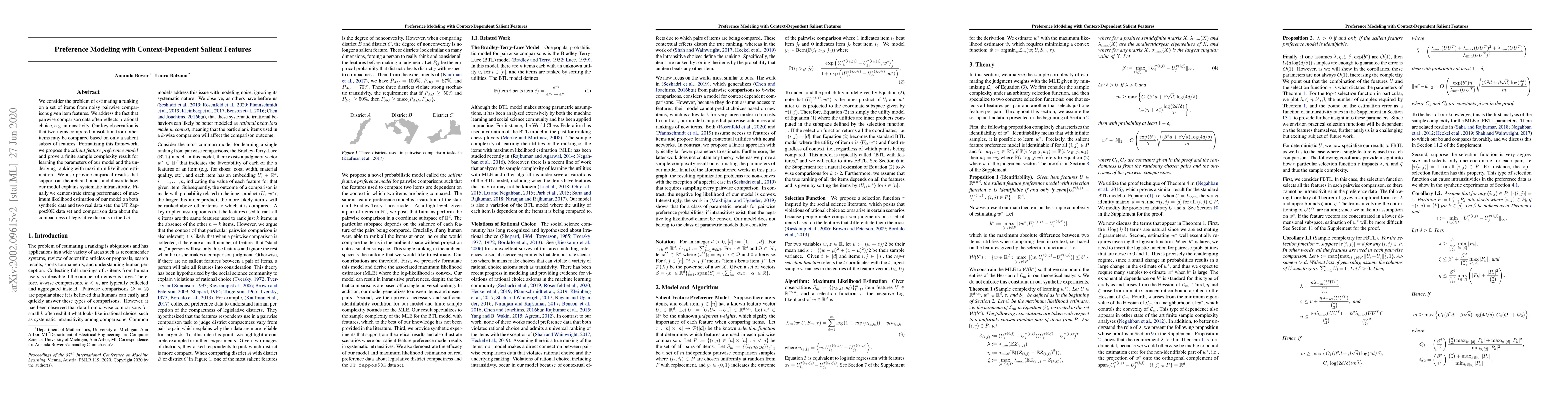 We consider the problem of estimating a ranking on a set of items from noisy pairwise comparisons given item features. We address the fact that pairwise comparison data often reflects irrational choice, e.g. intransitivity. Our key observation is that two items compared in isolation from other items may be compared based on only a salient subset of features. Formalizing this framework, we propose the salient feature preference model and prove a finite sample complexity result for learning the parameters of our model and the underlying ranking with maximum likelihood estimation. We also provide empirical results that support our theoretical bounds and illustrate how our model explains systematic intransitivity. Finally we demonstrate strong performance of maximum likelihood estimation of our model on both synthetic data and two real data sets: the UT Zappos50K data set and comparison data about the compactness of legislative districts in the US.