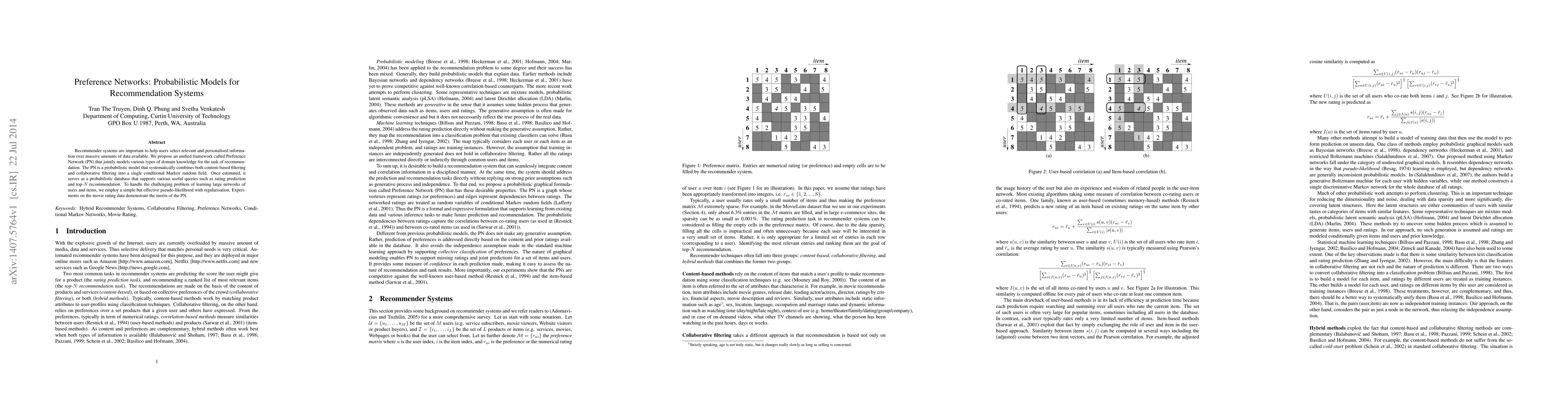 Recommender systems are important to help users select relevant and personalised information over massive amounts of data available. We propose an unified framework called Preference Network (PN) that jointly models various types of domain knowledge for the task of recommendation. The PN is a probabilistic model that systematically combines both content-based filtering and collaborative filtering into a single conditional Markov random field. Once estimated, it serves as a probabilistic database that supports various useful queries such as rating prediction and top-$N$ recommendation. To handle the challenging problem of learning large networks of users and items, we employ a simple but effective pseudo-likelihood with regularisation. Experiments on the movie rating data demonstrate the merits of the PN.