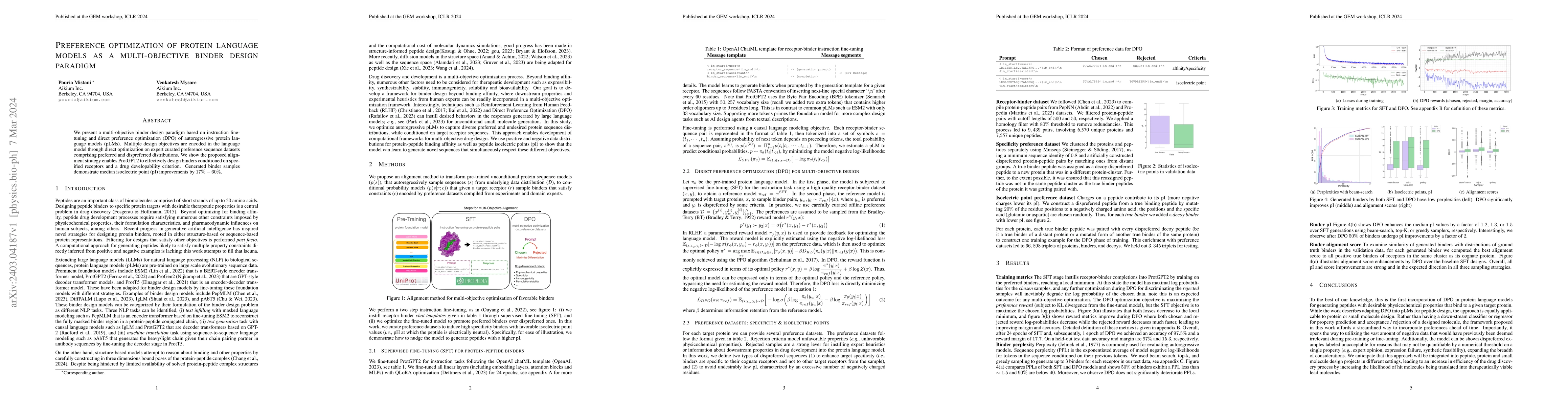 This research proposes a multi-objective binder design framework using fine-tuned protein language models optimized through direct preference optimization. The approach effectively designs binders with specified receptors and drug developability criteria, showing significant improvements in isoelectric point by 17%-60%.