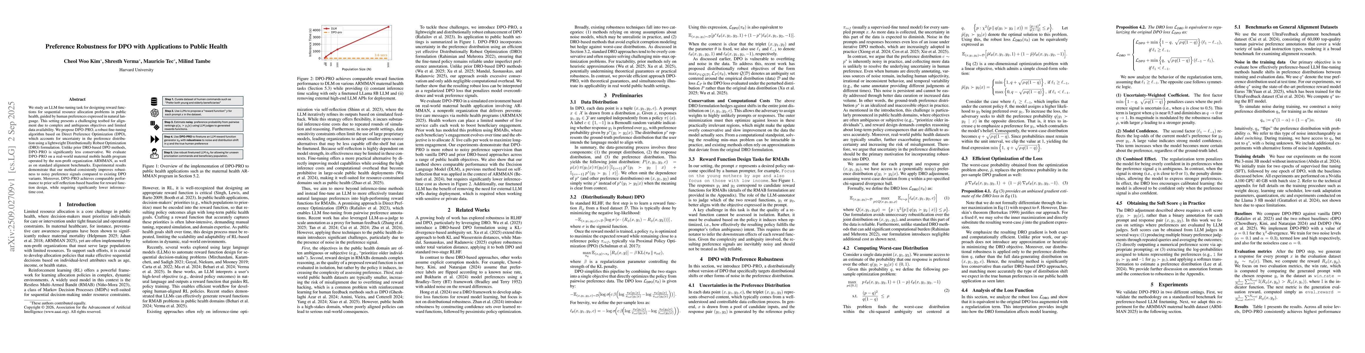 We study an LLM fine-tuning task for designing reward functions for sequential resource allocation problems in public health, guided by human preferences expressed in natural language. This setting presents a challenging testbed for alignment due to complex and ambiguous objectives and limited data availability. We propose DPO-PRO, a robust fine-tuning algorithm based on Direct Preference Optimization (DPO), which accounts for uncertainty in the preference distribution using a lightweight Distributionally Robust Optimization (DRO) formulation. Unlike prior DRO-based DPO methods, DPO-PRO is significantly less conservative. We evaluate DPO-PRO on a real-world maternal mobile health program operated by the non-profit organization ARMMAN, as well as on standard alignment benchmarks. Experimental results demonstrate that our method consistently improves robustness to noisy preference signals compared to existing DPO variants. Moreover, DPO-PRO achieves comparable performance to prior self-reflection-based baseline for reward function design, while requiring significantly lower inference-time cost.
